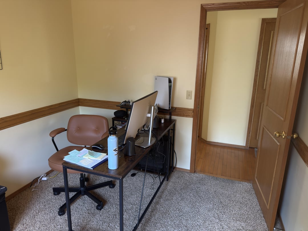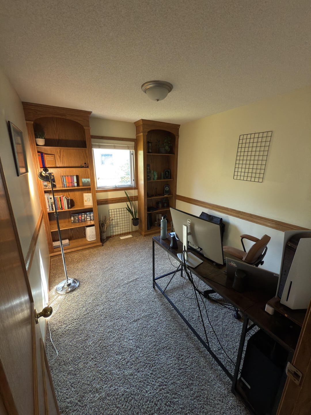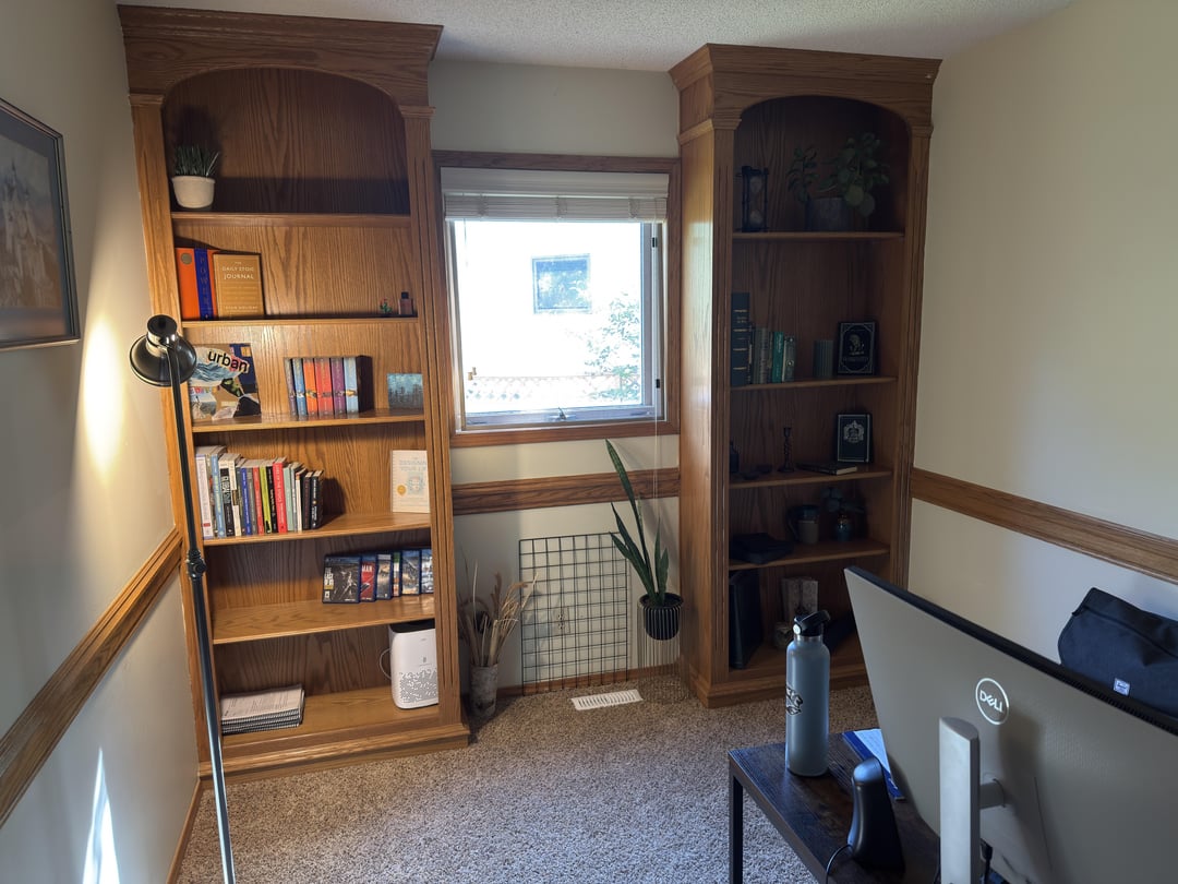 ねえ、私は新しいオフィスデンをセットアップしようとしています。ドアの反対側の壁には窓があり、棚が組み込まれているので、机をセットアップするのに苦労しています。 モニターがセットアップされているデスクでこれを機能させる方法についてのアイデアを聞きたいです!
