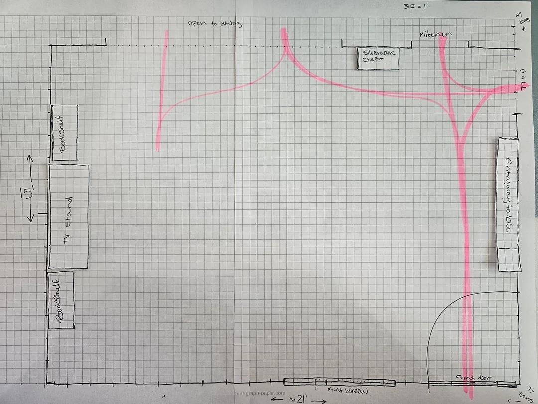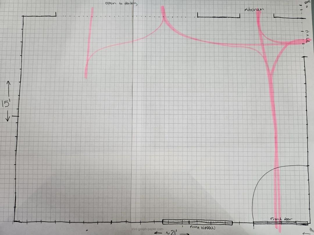 写真 – 最初は、家具なしでスケーリングする部屋で、ピンクで強調表示されています。 2番目には(少なくとも今のところ)保持する予定の家具があり、最後の2つは私が検討しているレイアウトです。1つは9×12ラグ、もう1つは10×14です。スケールは3ボックス= 1フィートまたは4つです" ボックスごと。