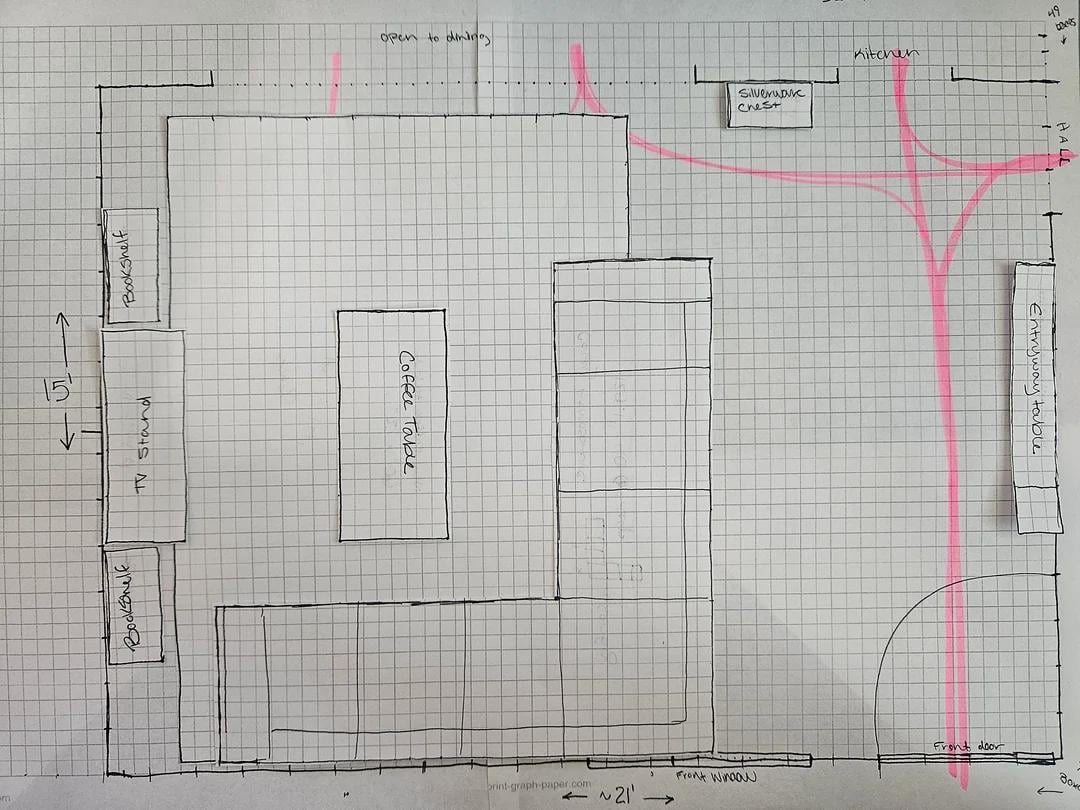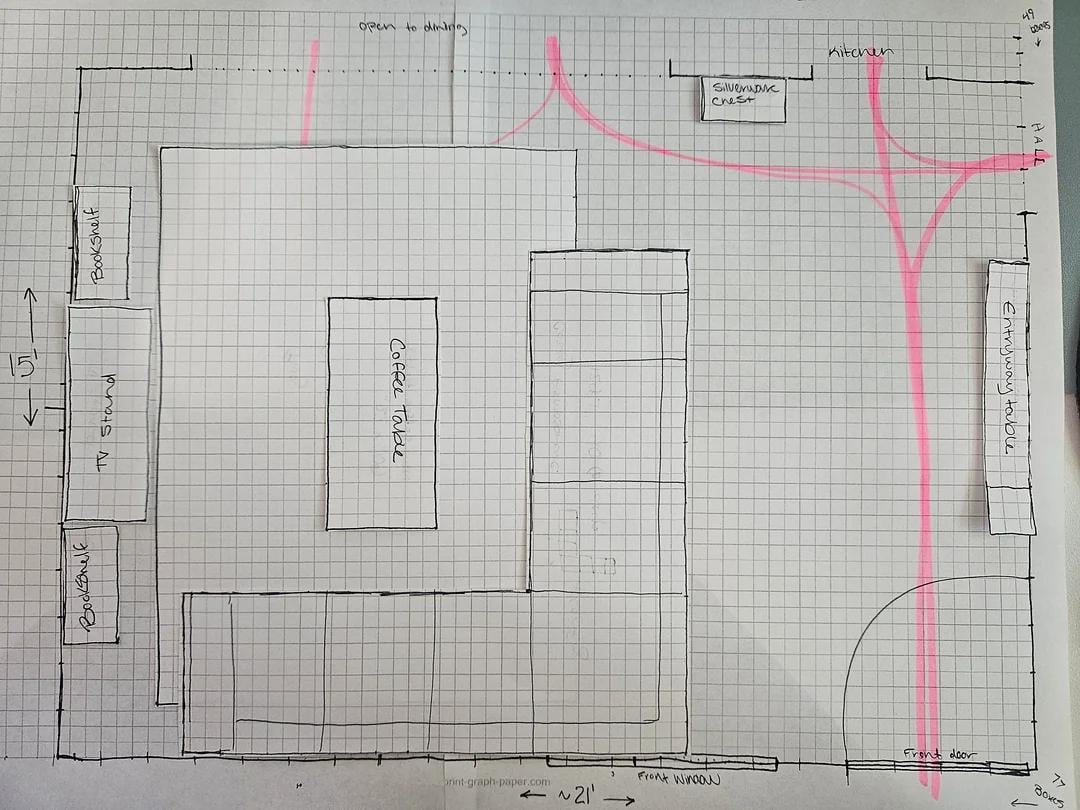 図に描かれている断面図は、4×4レイアウトのCozey Atmosphereです。ラブサックとメイシーズラドリーも検討しています。夫と私はラウンジが大好きで、2匹の犬を飼っていて、モジュール式で洗えるものを好むでしょう。また、正面玄関からの旅行の道も検討しています。ご覧のとおり、大きなセクショナルであっても非常に広いですが、セクショナルのバックアップはテレビの視聴距離を妨げます。玄関のスペースに取り組む方法に関するアイデアは歓迎されます!私はすでに素敵な入り口のテーブルと壁に絵を描いていますが、それはまだ巨大な通路です。素敵なソファテーブルまたはコンソールと見なされますが、両側にコンソールを持っているのは奇妙に感じるでしょうか?
