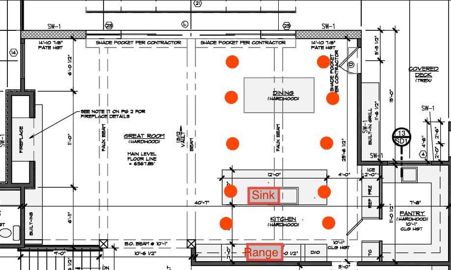 このキッチンの照明ソリューションの助けが必要です。このキッチンには、壁の10フィートから始まる傾斜天井があり、射程があり、ダイニングエリアが14フィートの反対側の壁で終わります。写真で見ることができるように、これらの壁に垂直な壁に垂直に走るフェイクビームがあります。キッチンとダイニングエリア全体に缶詰のライトを均等に配置するだけで、ダイニングテーブルの上に1つの直線的なペンダントが付いていました。ただし、フェイクビームはこのすべての真ん中にあるため、電気技師は、シンクなどの作業領域のすぐ上に十分な光になるかどうかはわかりません。ビームに干渉するのではなく、シンクエリアを照らすように、缶を照明する方法についての提案や解決策はありますか?線形ペンダントのライトボックスをダイニングテーブルの上に置くには、そのビームがライトボックスを司会する場所の真ん中に置きます。