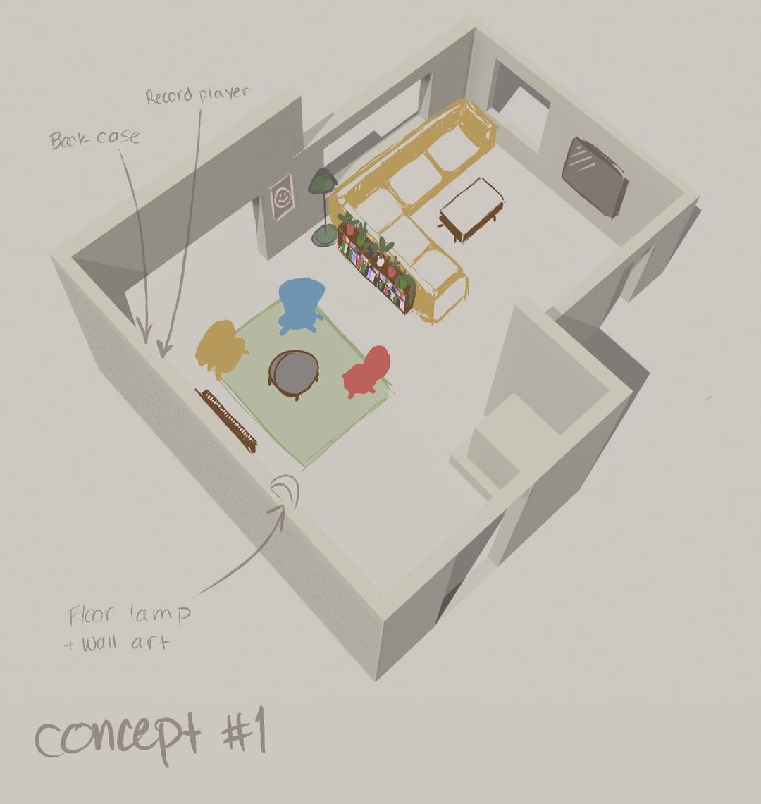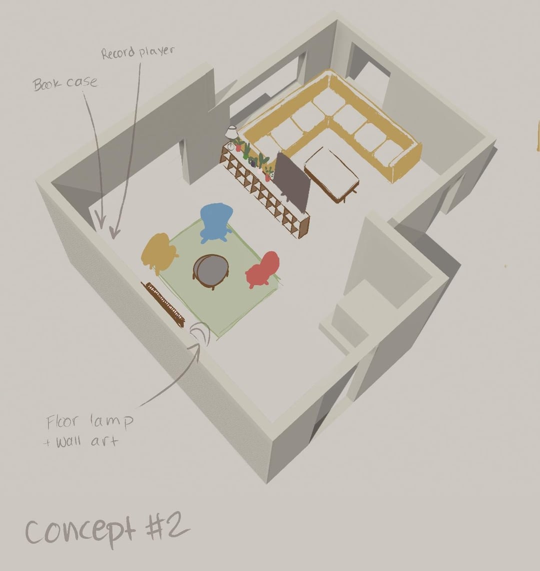 おい!彼氏と私は、すでにそこに住んでいる友達と一緒に家に引っ越しています。現在のリビングルームのレイアウトは私を悩ませています。それは部門のない大きなスペースであり、テレビはソファから遠すぎます。既存の家具があり、私たちは私たち自身のいくつかを持っているので、いくつかの再配置が関係なく起こる必要があります。