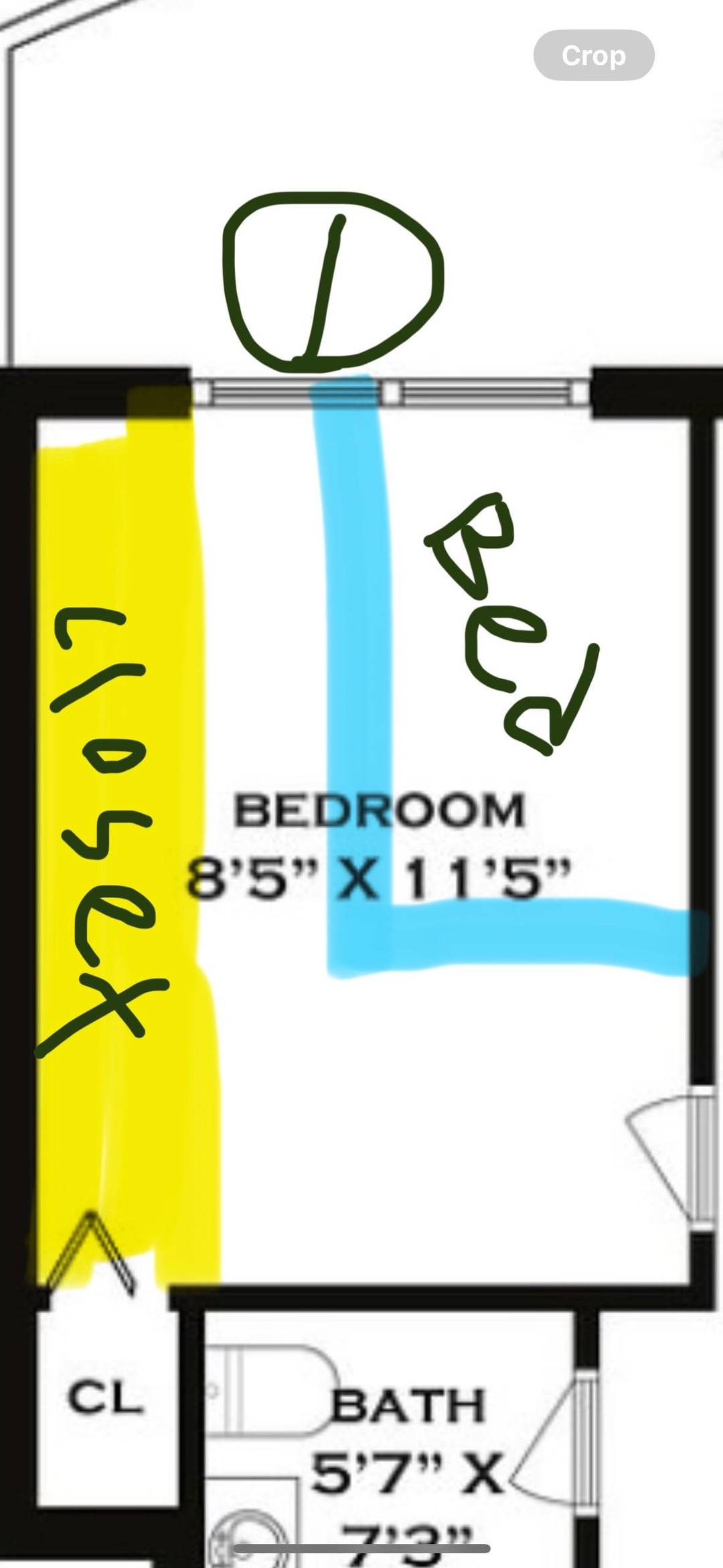 もう1つのアイデアは、ドアが遠い壁に向かっている底部の壁に沿ってクローゼットを置くことです。それは私がそこにヘッドボードを持って右の壁にベッドを置くことができるでしょう。