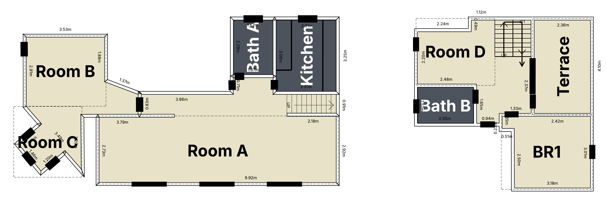 - ルームB+Cは1つの部屋の2つの部分を構成し、よりコンパクトです。ルームB(3.5mx 3mまたは12フィートx 10フィート)とルームCはリッテ床床です。
