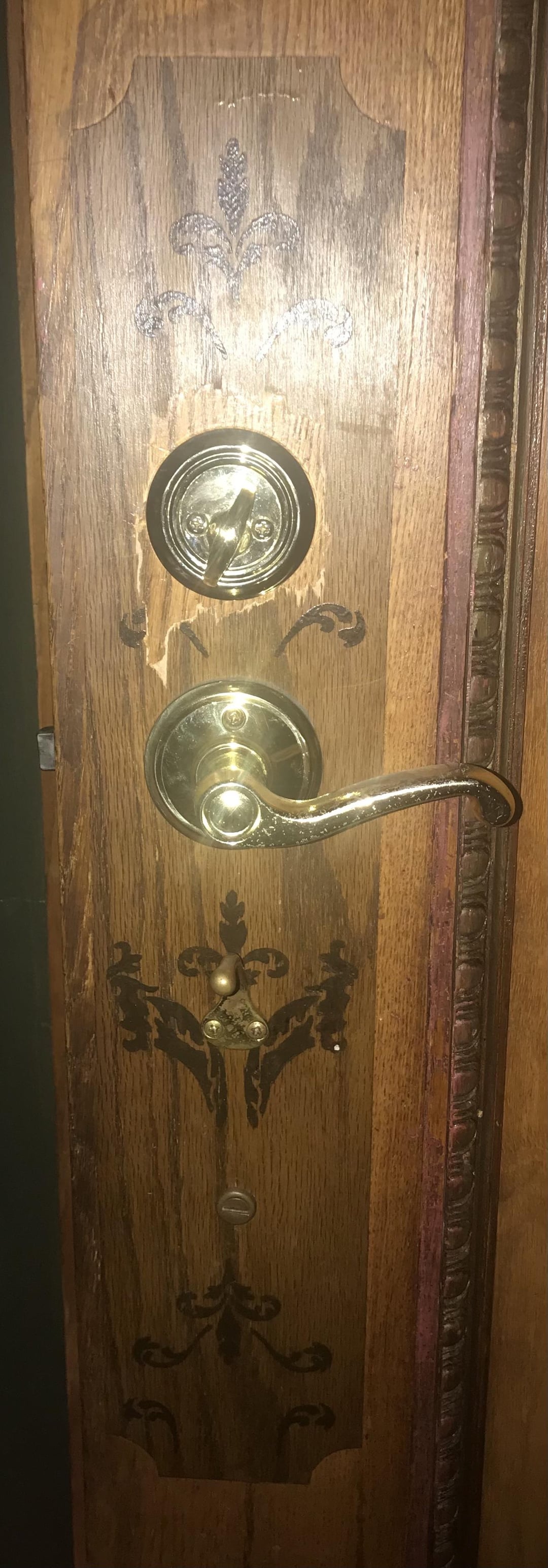 私はこれで何をすべきだと思いますか? (ドアとハンドルの間の木製の部分)。ビクトリア朝のスタイルのドアで、それは削り取られて色あせています。何らかの変色があるので、ここに何かを持っているのは良いことだと思います。しかし、私はあなたたちがどう思うのだろうと思っていましたか?ありがとう