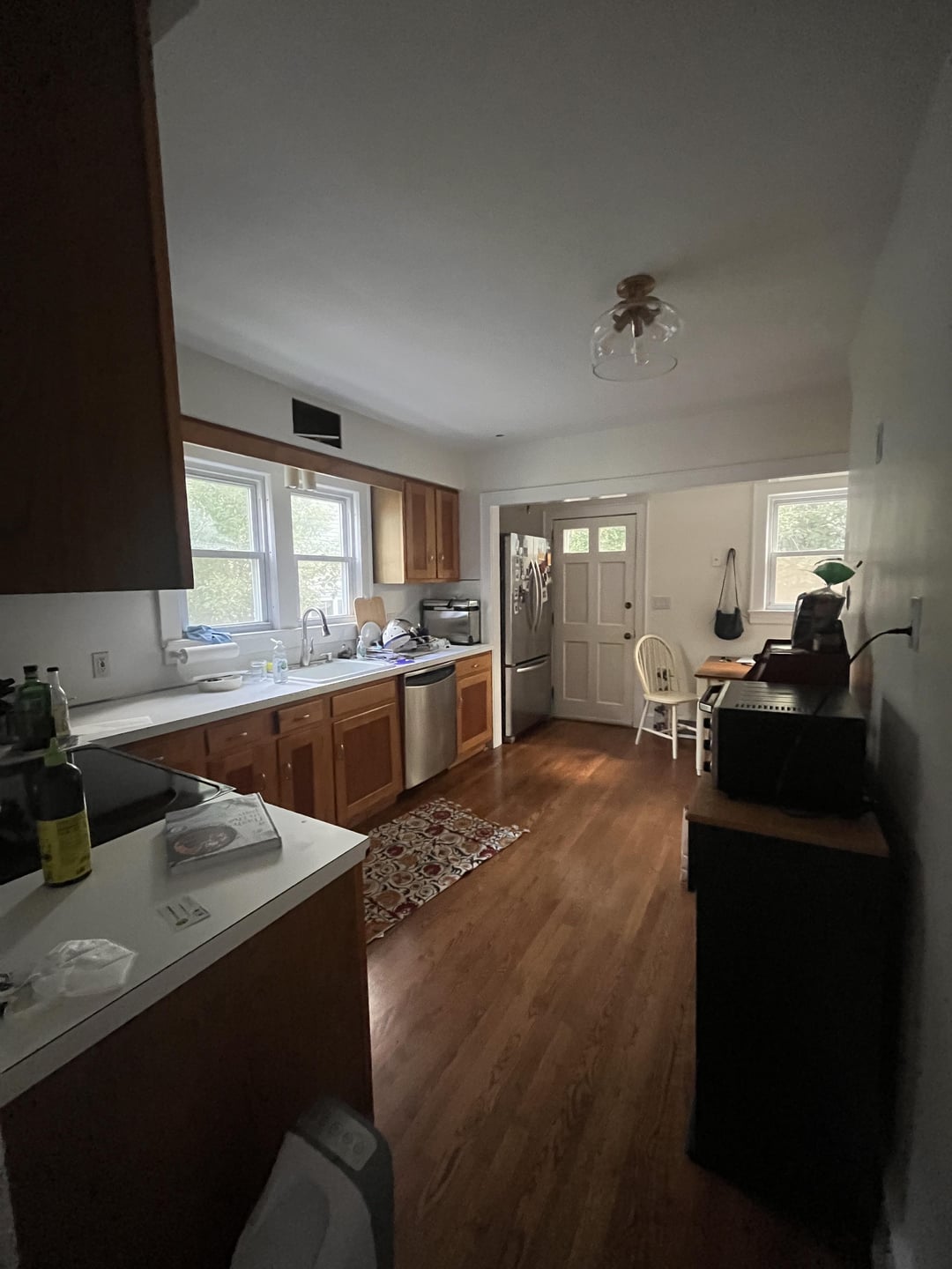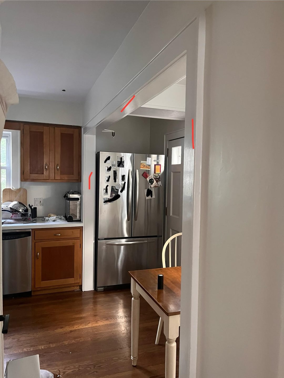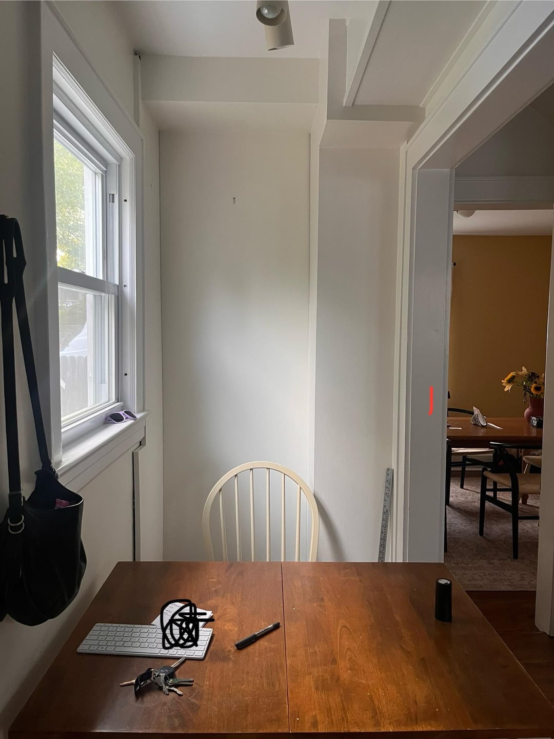キッチンは、負荷ベアリングではなく、降りることができるこの奇妙な壁(赤でマークされた)で区切られています。壁を取り外すと、エリアがエリアを開き、より多くの座り込みスペースがありますが、窓の近くの領域がうまく利用されていないように感じます。