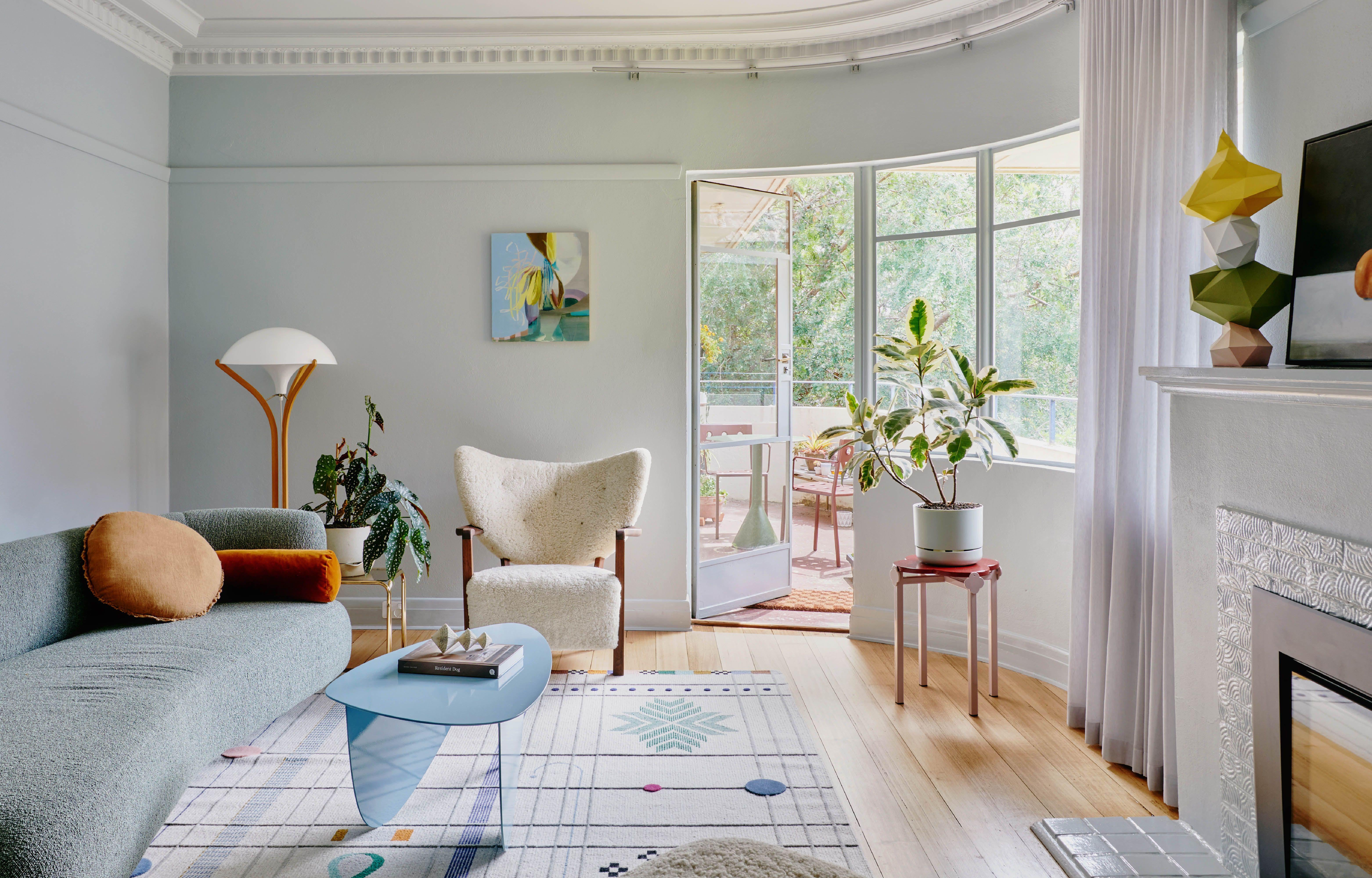 オーストラリア、ビクトリア州、メルボルン、パークビル、パークビル、改装されたアールデコアパートメントに湾曲した壁があるリビングルーム [6250×4000]