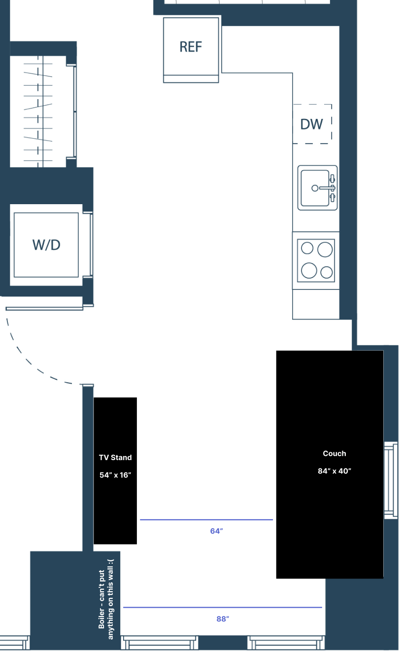 キッチンのレイアウトを、リビングルームにどのように開くかについてのコンテキストのために追加しました。今、私は2枚の家具(カウチとテレビスタンド)を持っているので、私は残りのスペースを最もよく使用する方法についてのアイデアを受け入れています!小さなコーヒーテーブルが必要ですか、それともスペースを節約するために代わりにエンドテーブルを用意する必要がありますか?それは小さなスペースなので、どのサイズのテレビを手に入れるべきですか?あらゆる種類の小さなテーブル/椅子のスペースはありますか?夕食をどこで食べられるかを把握したいです笑