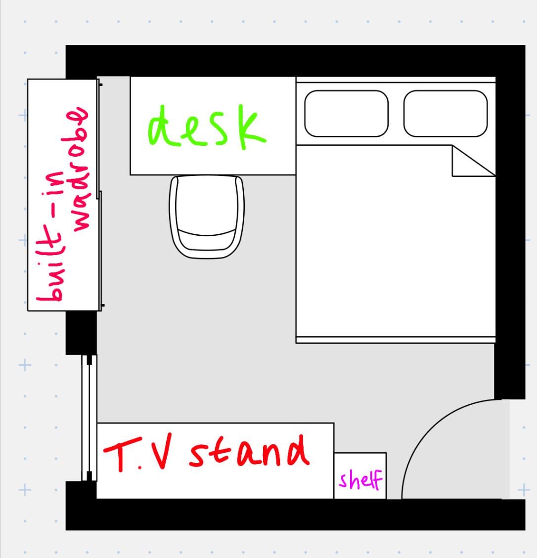 これは今のところ私の現在の部屋のレイアウトです、私はこれがロングショットであることを知っていますが、私の部屋をもう少し感じさせる他のレイアウトはあります、idkは広々としていますか?