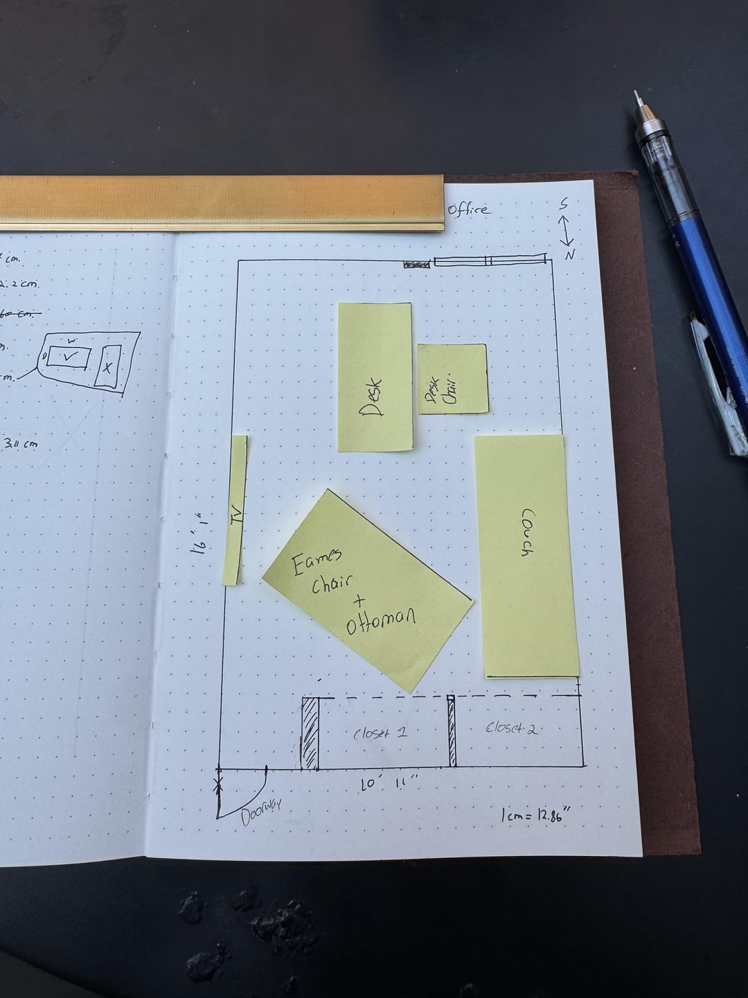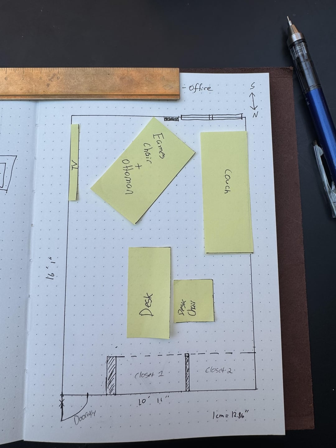ホームオフィスをレイアウトする方法についてのアドバイスを探しています。フロアプランの2つの提案を添付しました(オフィスはラベル付けされた部屋になります "2ベッドルーム")、およびスペースの写真。カットアウトは、私の現在のアイテムに基づいてスケールに基づいています。 90" 記事カウチ このスペースには大きすぎると思います。イームズチェアの切り抜きは、椅子/オットマンに加えて、その周りの推奨クリアランスに基づいています。" x 40" (あなたが私のように、なぜそれが巨大に見えるのか疑問に思っていた場合)。