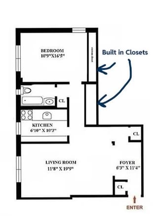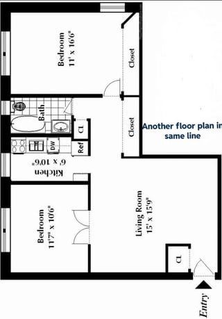 NYCの1B/1Bを約700平方フィート見ています。この既存のフロアプランを変更してホームオフィスを追加する方法をスケッチしようとしていましたが、苦労して提案が大好きです。廊下には、削除できるクローゼットが組み込まれています。同じラインの他のユニットは、リビングルームのホワイエ/背面にあるすべてのクローゼットを削除するか、小さな2番目のベッドルームエリアを作成しました。キッチンとバスルームでの配管は、おそらく私たちが触れたくないし、余裕のないものです。
