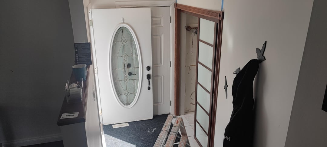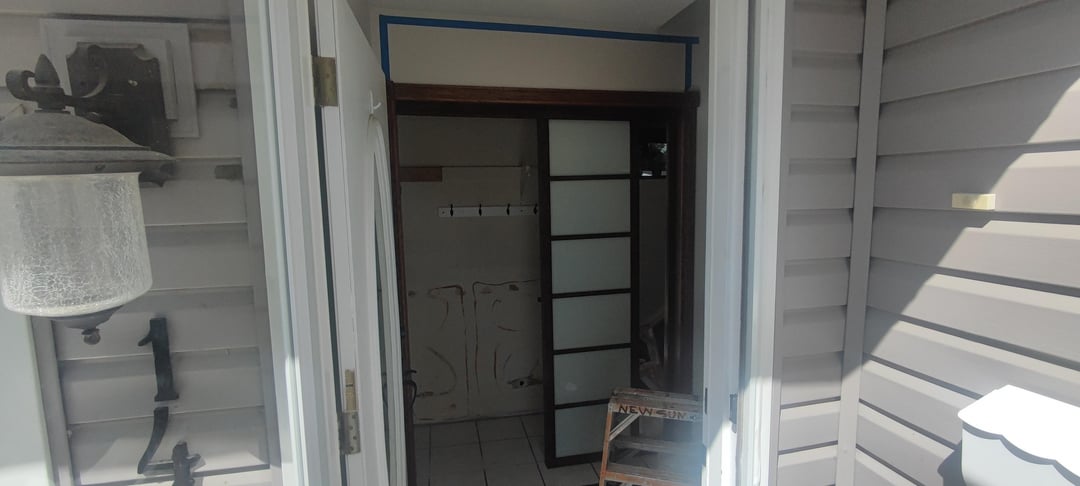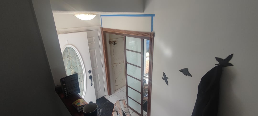 私たちはこのフロントクローゼットが情熱を持って嫌いです(私たちはそれを私たちの運命のクローゼットと呼んでいます)。クローゼットの半分に一度にアクセスするのは痛みです。ダブルスイングドアをインストールするだけで、アイデアを愛していないことを検討しました。今、私たちはドアを完全に取り外し、クローゼットの高さを最大化することを考えています。青いテープは完成した高さを表します。