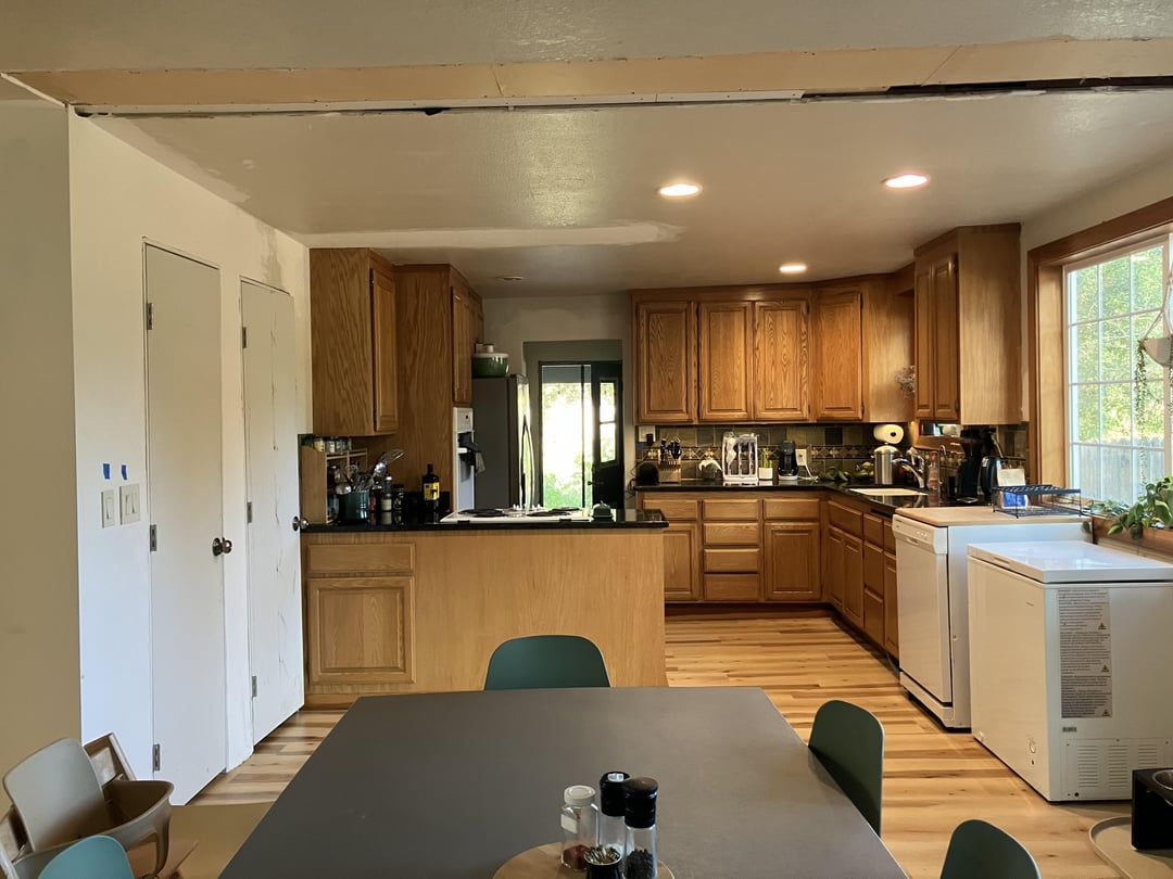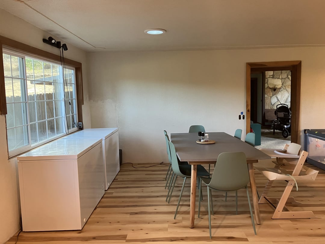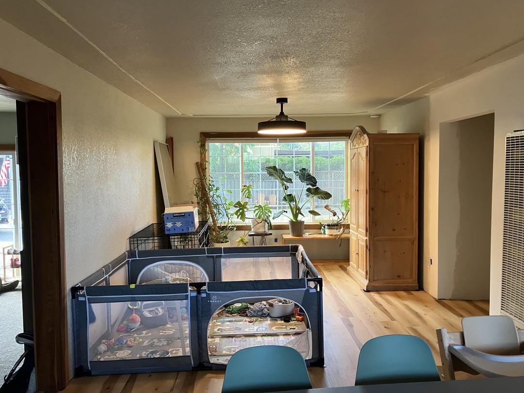 この家は明らかに「新しい赤ちゃんを持つ初めての住宅所有者」DIY Messです。キッチンとダイニングテーブルの間の壁を下ろしました。部屋はLのような形をしています – 最初の写真はキッチンからダイニングテーブルに向かって見ています。2番目はダイニングテーブルからキッチンを振り返り、3番目はダイニングテーブルから部屋の反対側を見ています。残念ながら、私たちは現在の資金によるものであるため、ハニーオークキッチンにこだわっています。壁を降ろすと部屋を少しぎこちなくしたことは知っていますが、キッチンの狭いスペースを立てることができませんでした。多くの家具が変わりますが、遊びのペンと胸の冷凍庫は、赤ちゃんが少し年上のときに間違いなく行きます。