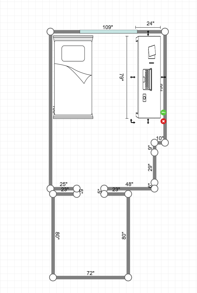 この小さな寝室をレイアウトしようとしています。現在、机とツインXLベッドを持っていますが、ドレッサーと本棚が必要です。ウォークインクローゼットはスペースに役立ちますか?ある種のナイトスタンドを考えていました。部屋にも照明が必要ですが、現在は照明がありません。どんな助けも大歓迎です。