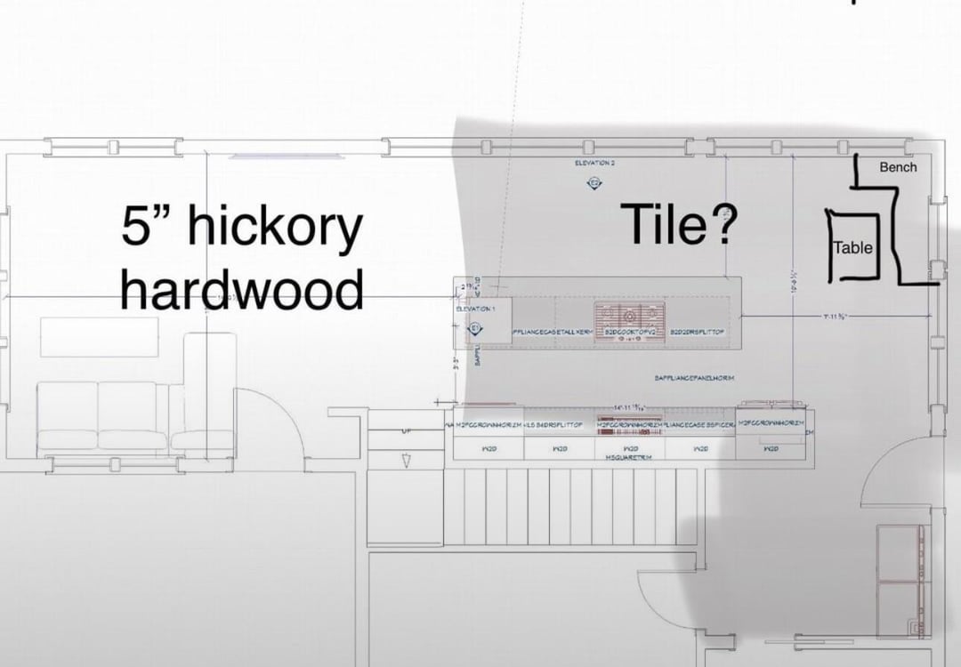 私はケープコッドの家族のコテージで腸のリノをやっています。私は、海の草とビーチの屋外の環境を反映するために、緑と黄褐色の素朴な色調を備えた沿岸の豪華なミッドセンチュリーの雰囲気を求めています。床は5インチの自然なヒッコリー(床に接続された写真)になりますが、私はキッチンと洗濯エリアでタイルをすることを考えていました。