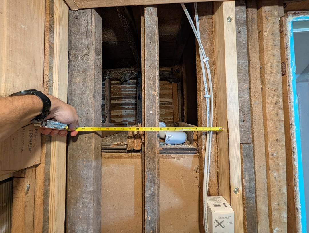 展示a (写真2-5):およそ3フィートの深さx高さ2フィートx幅5フィート幅の幅のスペースがあり、ほぼ目のレベル(画像1)。オープニングは約16 x 20です" その前に表面的なスタッドがありますが、問題なく削除することができます。空洞は左に続き、約4フィート。画像4は、はしごでのみアクセスできる隣の部屋の小さなアクセスハッチからの空洞を示しています。私たちは古典的な壁の安全を考えていましたが、アイデアが大好きです。