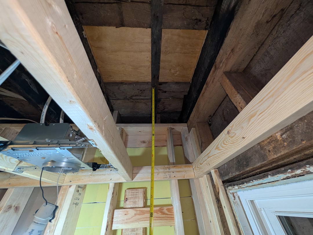 展示b (写真5-11):約14があります" 高X 32" 1つまたは2つの根太湾を伸ばすドロップメチールの上の広いスペース。天井に隠すことができるクールで実用的なプルダウンストレージシステムのアイデアはありますか?