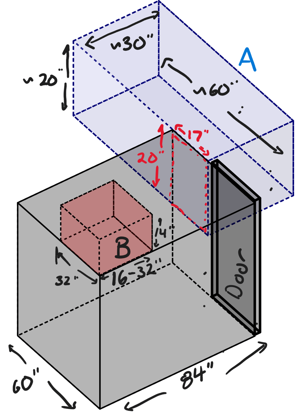 家は2階建てですが、8つの異なる飛行機に基づいて構築されています(寝室の1つの真ん中にステップアップさえあります)。その結果、根太の上にたくさんの寝台車があり、壁にはたくさんの小さな空洞があります。問題の部屋は、廊下の端から建てられた小さな(5フィートx 7フィート)のオフィスです。ストレージのために創造的に使用することを懇願する2つの領域があります。おおよその寸法を備えた画像1のクイックスケッチ。
