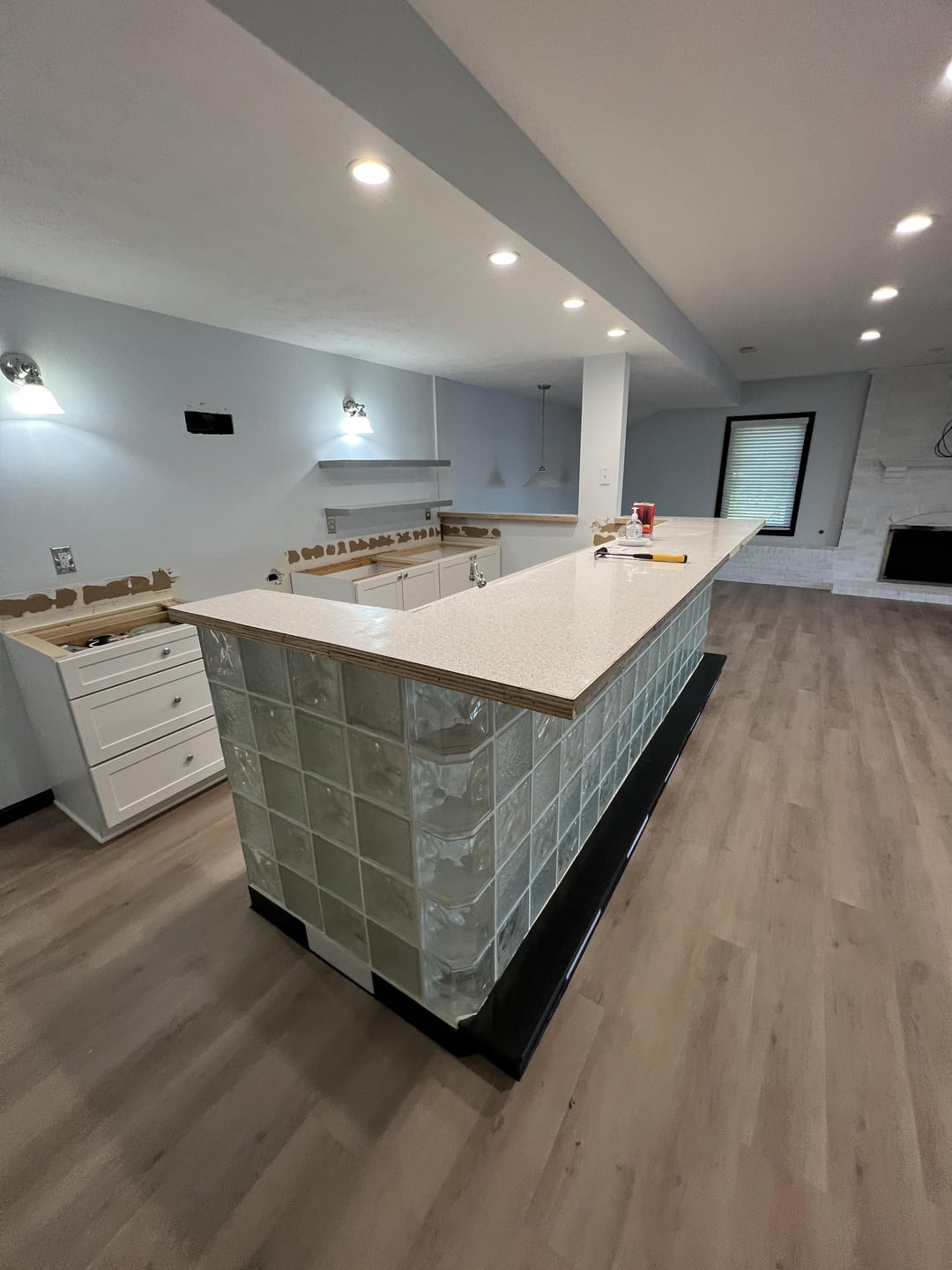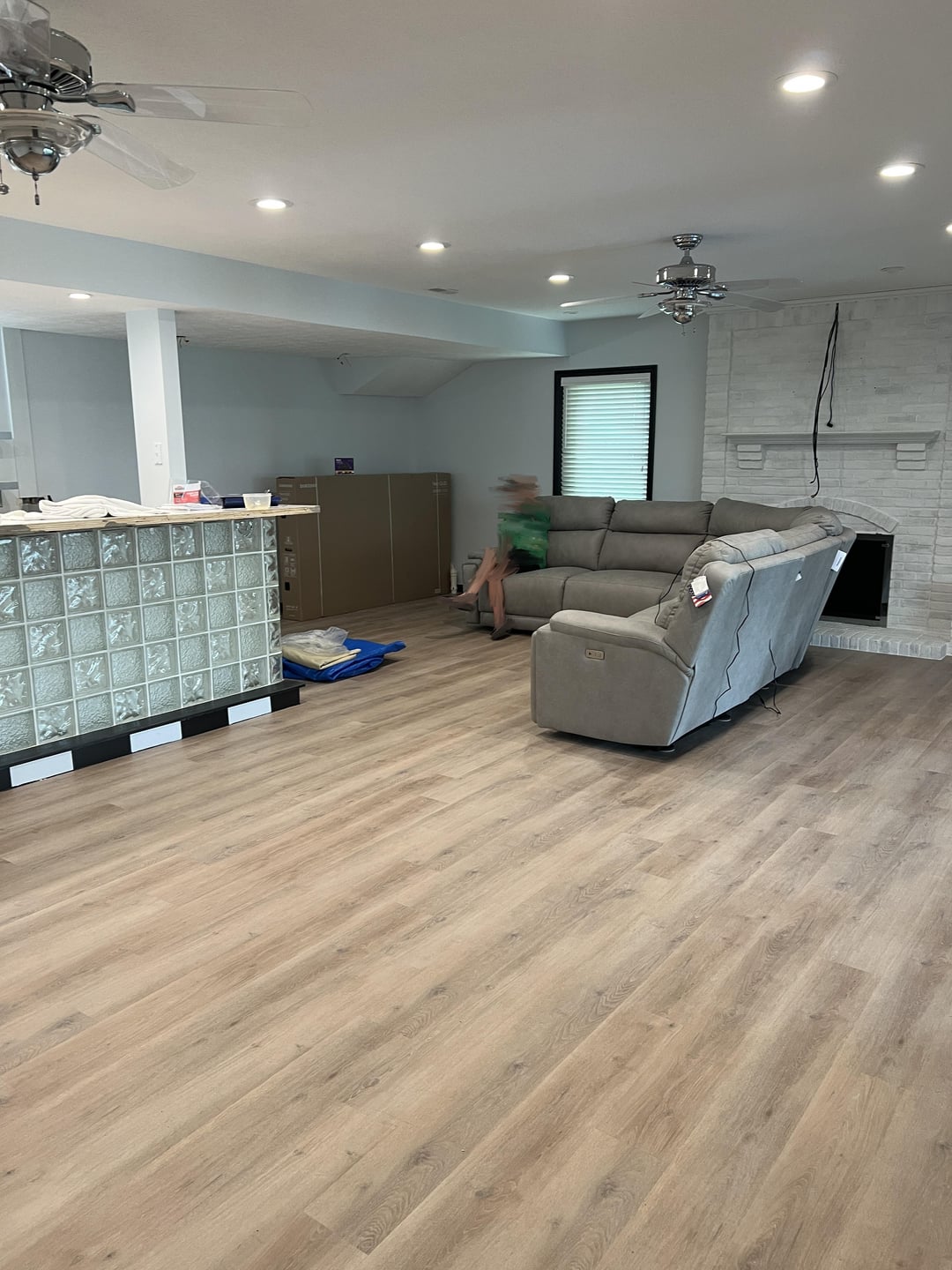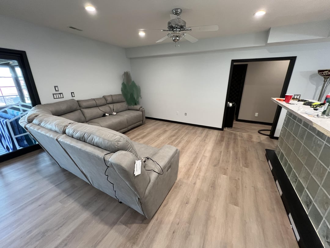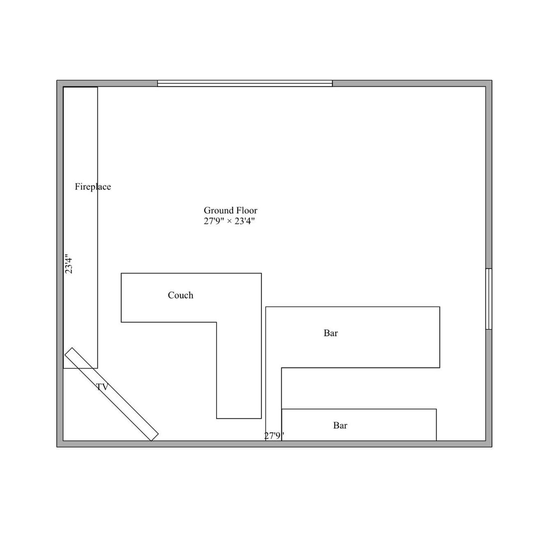 湖の家の1階の部屋で作業していて、インスピレーションを使うことができます!スペースはほとんど空白のキャンバスであり、バー/キッチンエリアだけ(現在はやり直されています)に加えて、実際にはどこにも収まらないように見えるソファとテレビがあります。