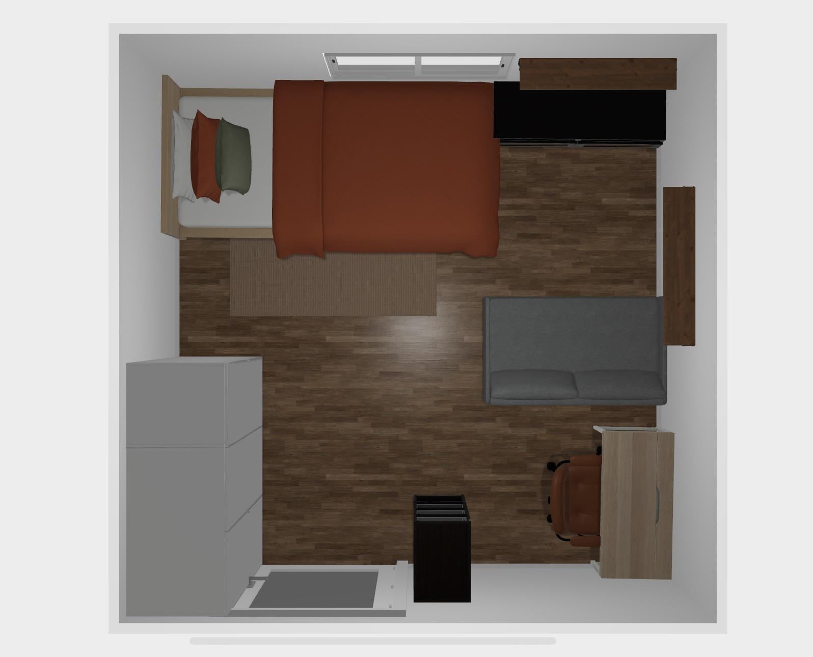 部屋は345x350cmで、10代の部屋として機能するはずです。ベッドには全長にわたる貯蔵容器が展開されているため、開くにはスペースが必要で、ベッドのそばに直接置くことはできません。私がここに持っているものについてのアドバイス、批評はありますか?