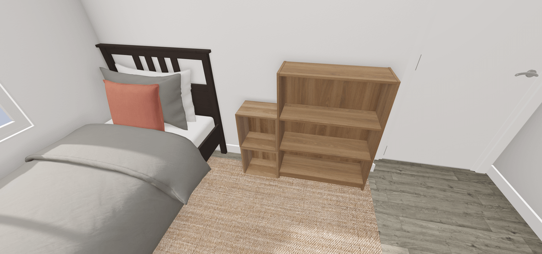 この小さな寝室のレイアウトはどうですか?私は本のためにストレージが必要であることに不満があります、あまりにも高すぎないナイトスタンド+本棚はありますか? 2番目の画像はどうですか?また、ベッドを他の壁にひっくり返すべきですか?どんな提案も感謝しています