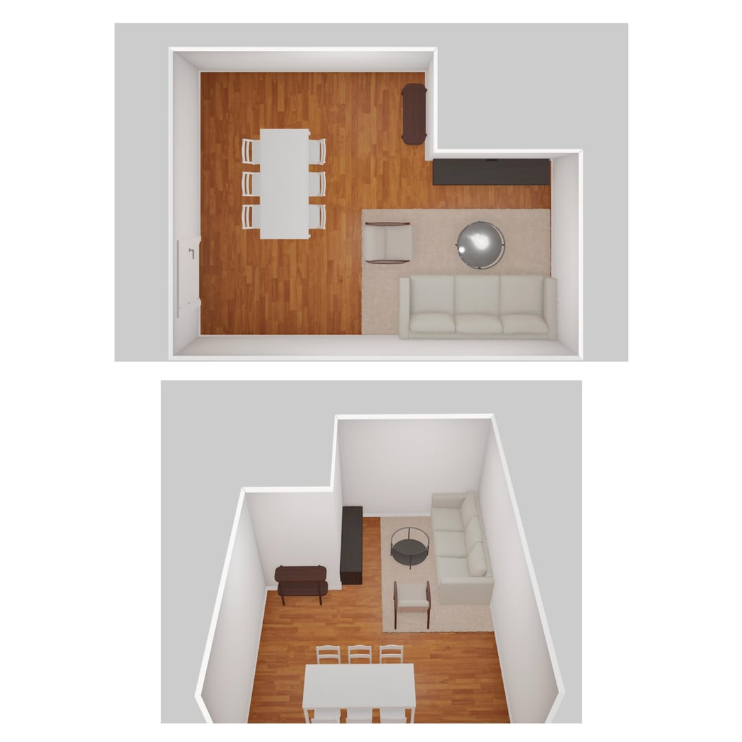 やあみんな!私は私のL字型のリビング/ダイニングエリアのレイアウトに助けが欲しいです。