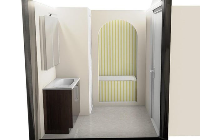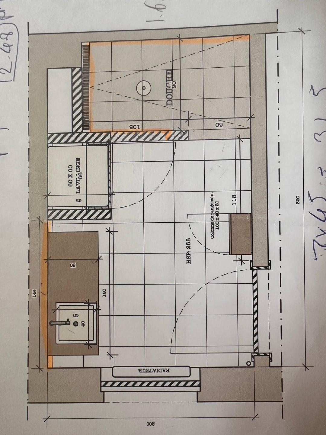 欠点:これはすべて少しきつくなるのではないかと心配しています。幅の場合、浴槽には約80cm(壁から73cm以上のスペース)、シンクに50(45 +追加)が必要です。これにより、シャワードアには70cmが残ります。