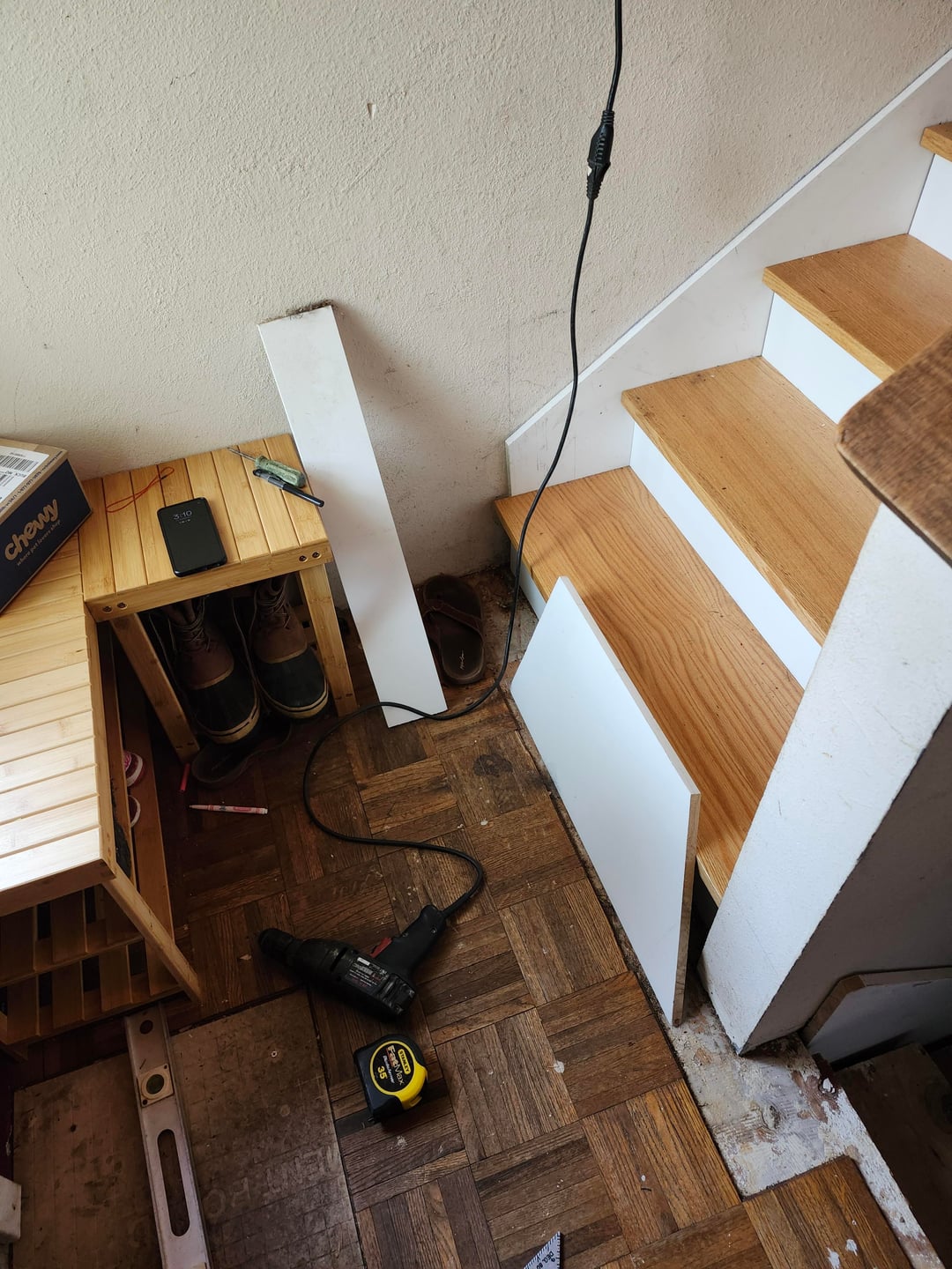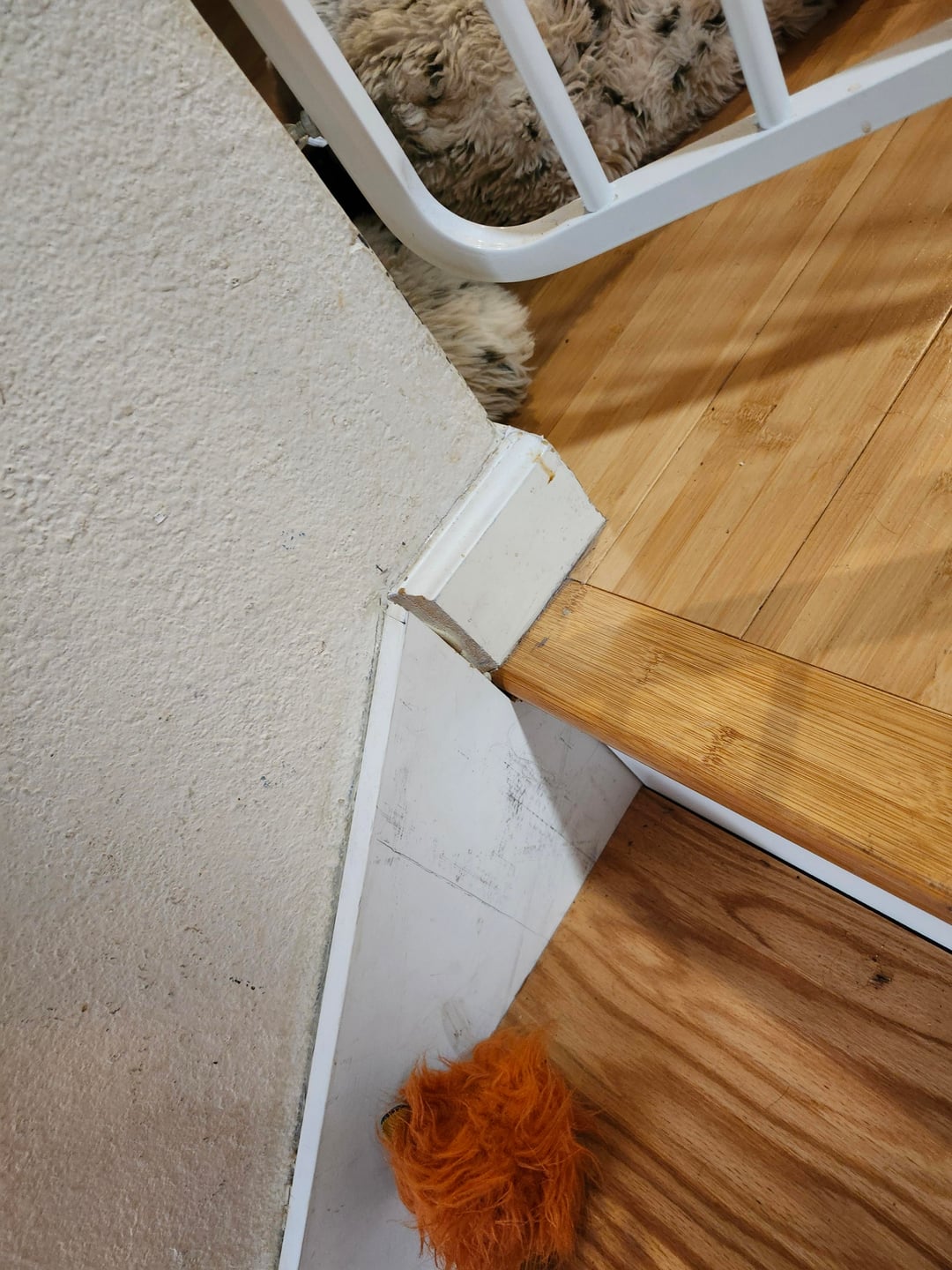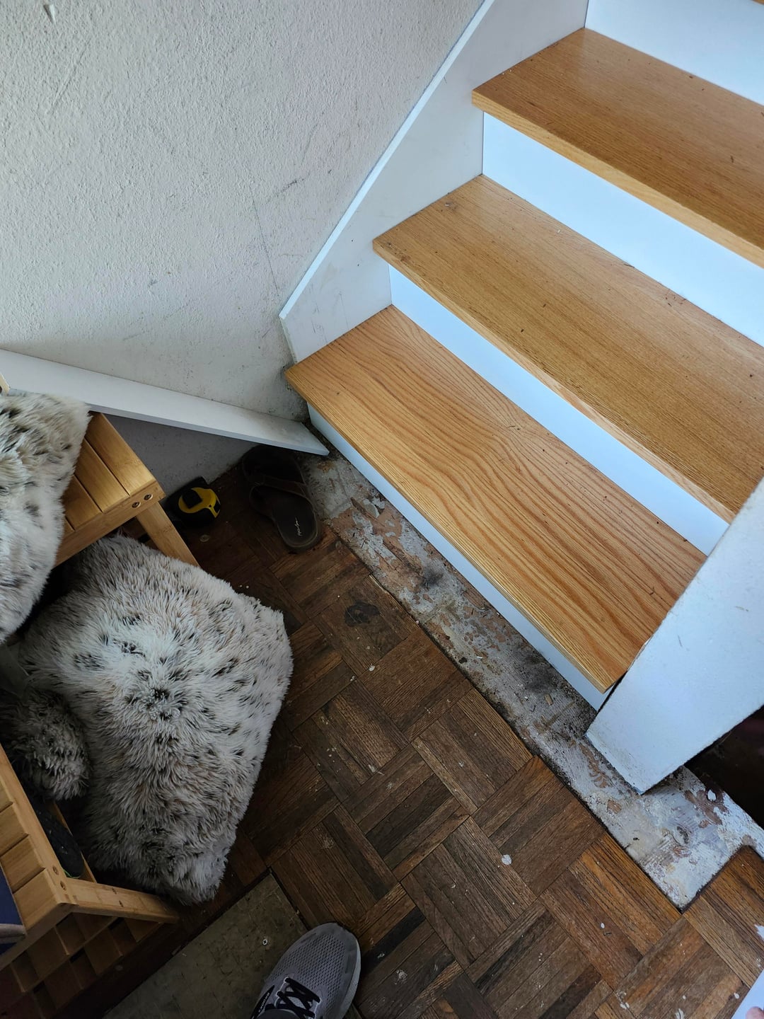 キンダはモールディングを台無しにしました。階段吹きの端で先細りし、異なる成形を使用しますか?着陸全体の背の高い成形はひどく見えます。上部の階段とモールディングはすでに(ごめんなさい)階段の上部に接着されています。私は同じですが、平らな側面と新鮮な短いモールディングを手に入れ、階段の成形の上部から一種のノッチを持っています(それが理にかなっていても、見栄えが良くなりますか?)私は迷子になって立ち往生していてひどいデザインスキルを持っています助けてください、私は何ヶ月もこのプロジェクトで冷凍されてきました