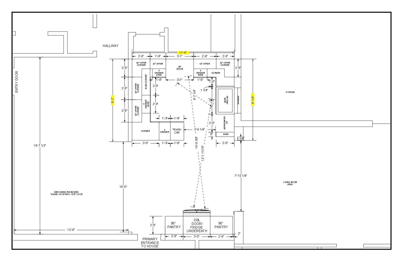 私は現在、カウンタートップがほとんどないので、キッチンのレイアウトを変更することを考えていました。キッチン全体は現在約です。 9 ‘x 11’-4" 黄色の寸法で示されているように。私はより多くのカウンタースペースを得るために物事を動かしようとしていますが、そうすることでパントリーと冷蔵庫の場所が現在の場所に変わります