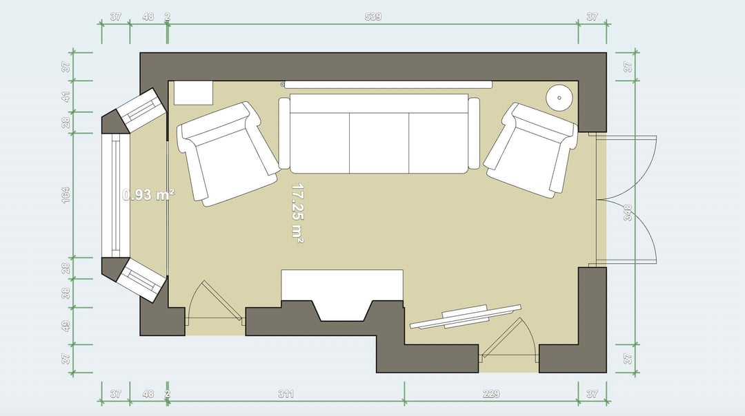 私の質問は、この部屋のレイアウトをどのように設計し、より多くの家具を含めるようにしますが、3つのドア間の交通の流れに影響を与えません(火の場所の両側、キッチンと廊下につながる2つの内部ドア、そして庭への二重のフランスのドア)ですか?