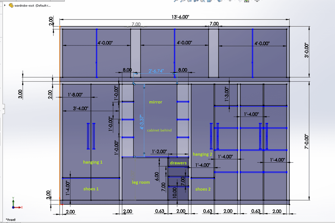インテリアデザインやワードローブのデザインについての経験はありません。私の最初のデザイン、または利用可能なスペース/制約を見て、アイデアや批評を共有してください。私のデザインに欠陥を指摘し(私は確かにたくさんあると確信しています)、解決策を提案し、さらには新しいもののアイデアを与えてください。