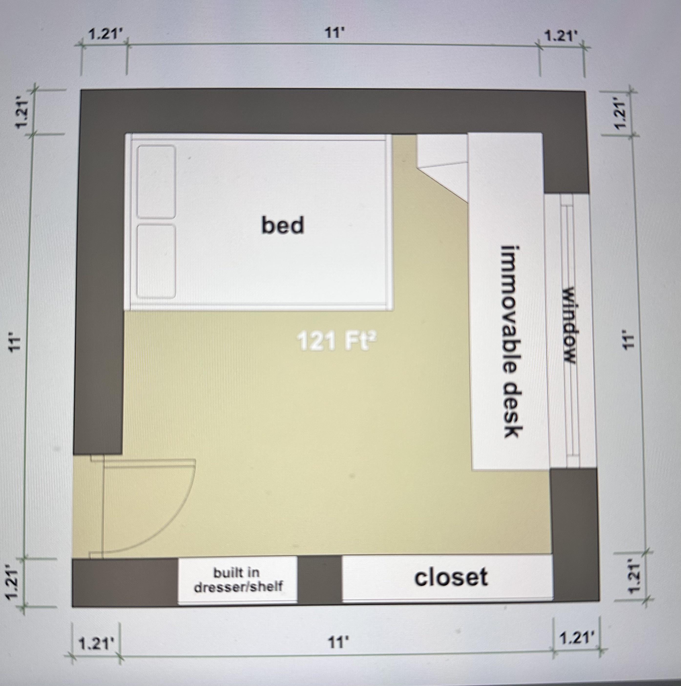 やあみんな!小さな寝室を再配置して、より広く機能的に感じられるようにする方法についてのアドバイスを使用できます。 •部屋のサイズ:11フィートx 11フィート(121平方フィート)•ベッド:フルサイズ•デスク:窓の下の1つの壁に沿って内蔵/不動。寸法:幅8.75フィートx 3.3フィートの深さ(不動の机は固体長方形の形状ではありません。3.3フィートは最も深いものです)•クローゼット:1つの壁に沿って、ドアの隣にある壁に沿って•ドア:内側の内側、内側の棚の近く