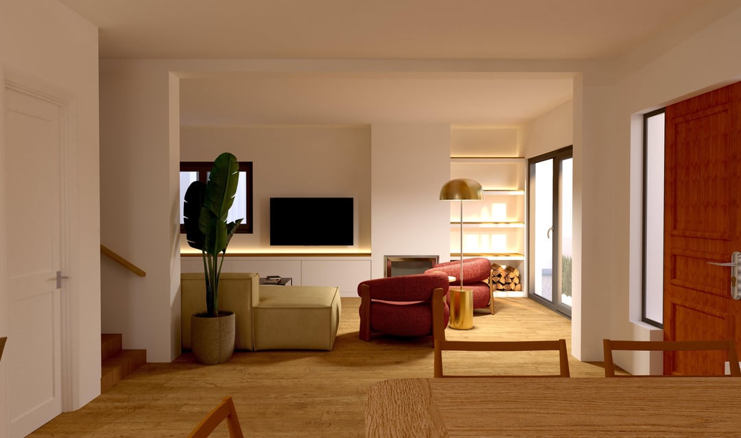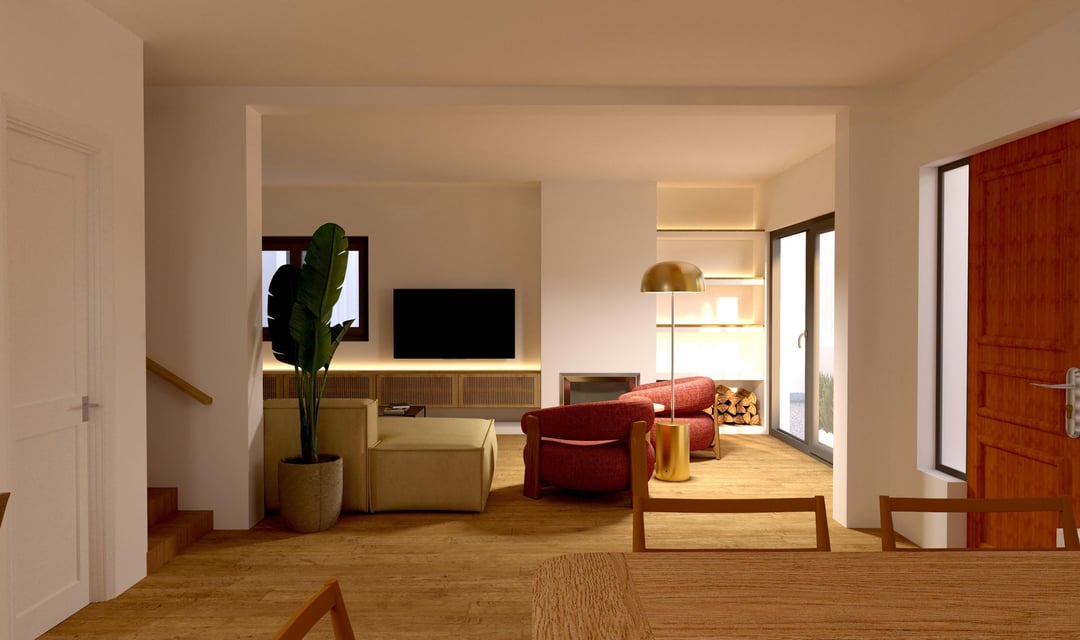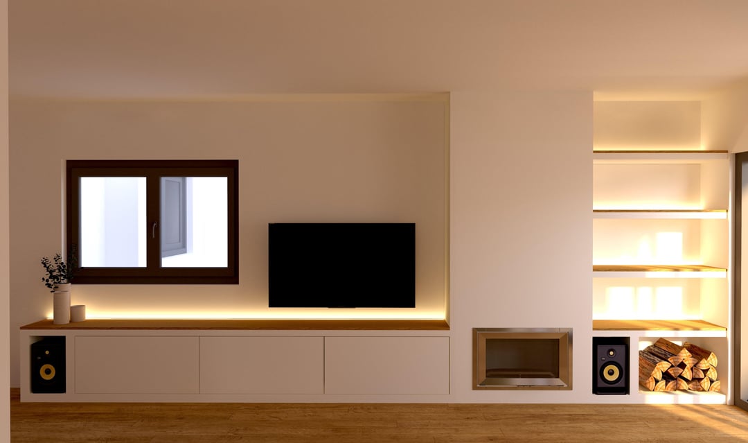 私の最初の選択肢は、ドアの前面でオークとラタンで作られたフローティングテレビコンソールのカスタムでした。スピーカーのための場所がいなかったことに気付いた後、暖炉の反対側と一致する内蔵バージョンにもっと傾いています。どちらが好きですか?
