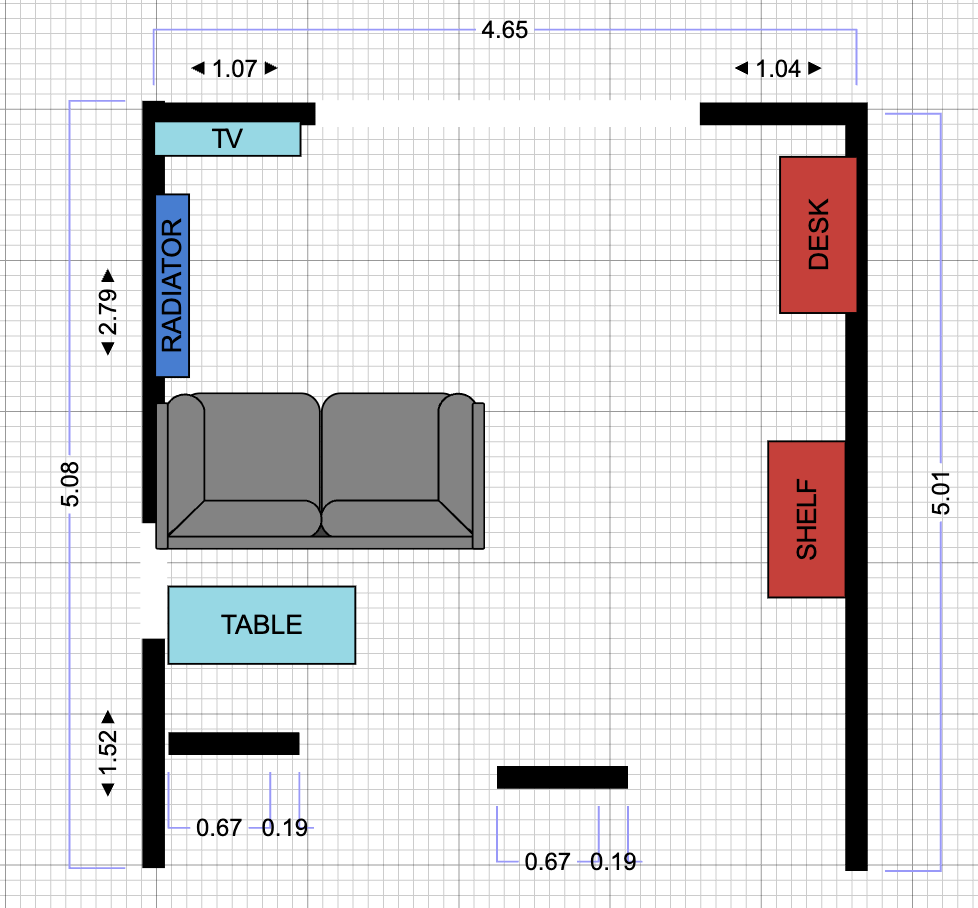 また、1つの壁に沿って非常に大きなラジエーター(非常に古い学校)があります。これにより、物事をうまく適合させるのが難しくなります(それなしでは、おそらく右の壁とテレビを前に置くことができると思いますが、その場合、机がどこに行くのかわからない。