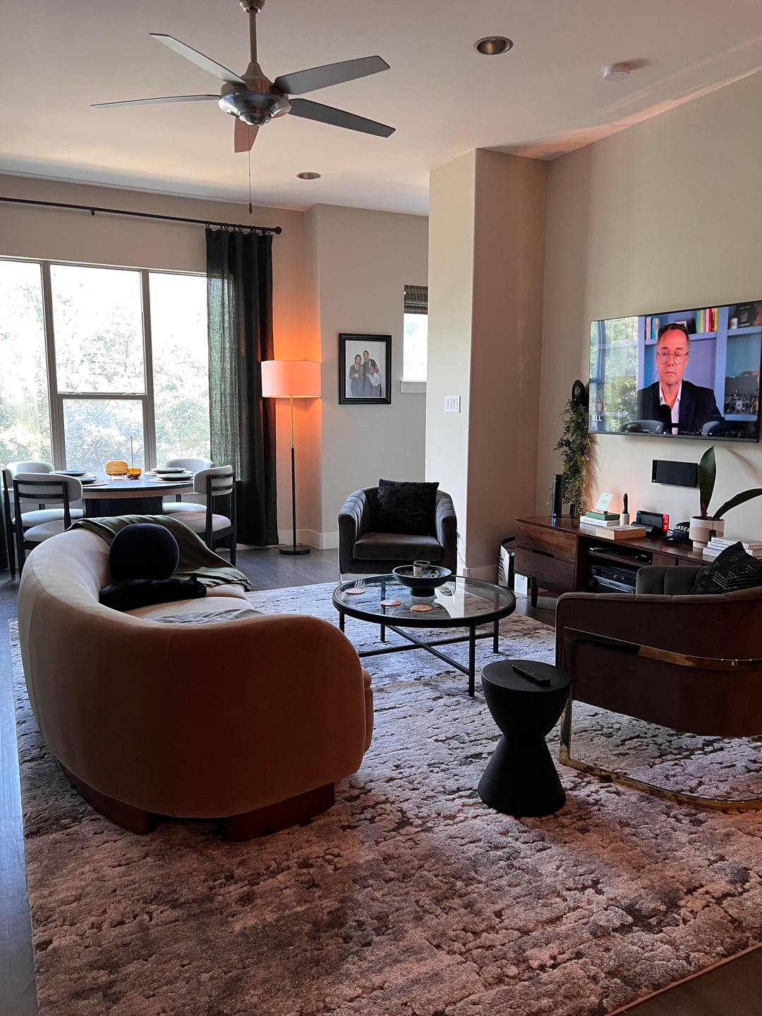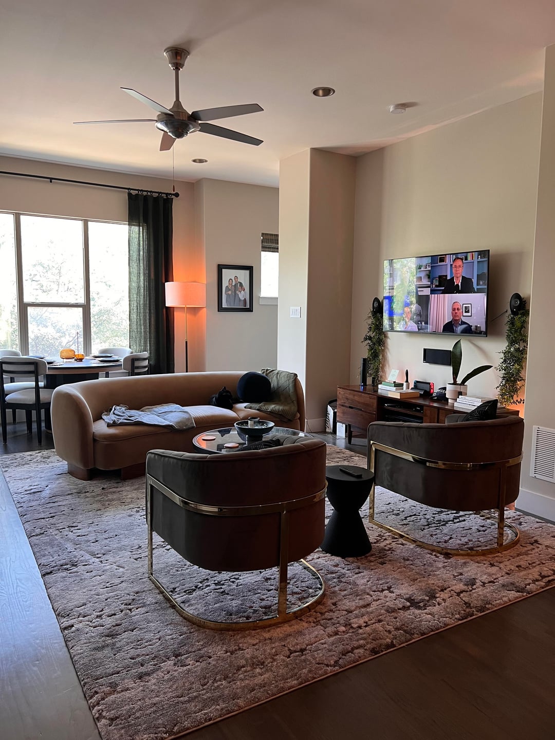 写真/オプション1-現在のセットアップ:湾曲したソファは、2つの灰色のアクセント椅子でテレビに面しています。少なくとも、コーヒーテーブルを交換し、灰色のアクセントの椅子を私のオフィスに移動し、一致するスイベルの椅子をソファで手に入れる可能性があります。 (ここにリンク: https://www.cb2.com/muir-camel-velvet-swivel-chair/s492466?storeid=&a = 501&pla_sku=492466&pcat=fu RN&TargetID = PLA-294682000766&CampaignID = 12505097199&AdGroupID = 124712638211&ADPOS =&CREATION = 504511 479249&device = m&matterype =&network = g&gclsrc = aw.ds&gad_source = 1&gad_campaignid = 12505097199&gbraid = 0aaaaadcnorwmb5_ogilhzmnlrgcixg1n-&gclid = eaiaiqobchmi8eq646hojwmvbr3uar3odbdxeaqyasabegjqfd_bwe))