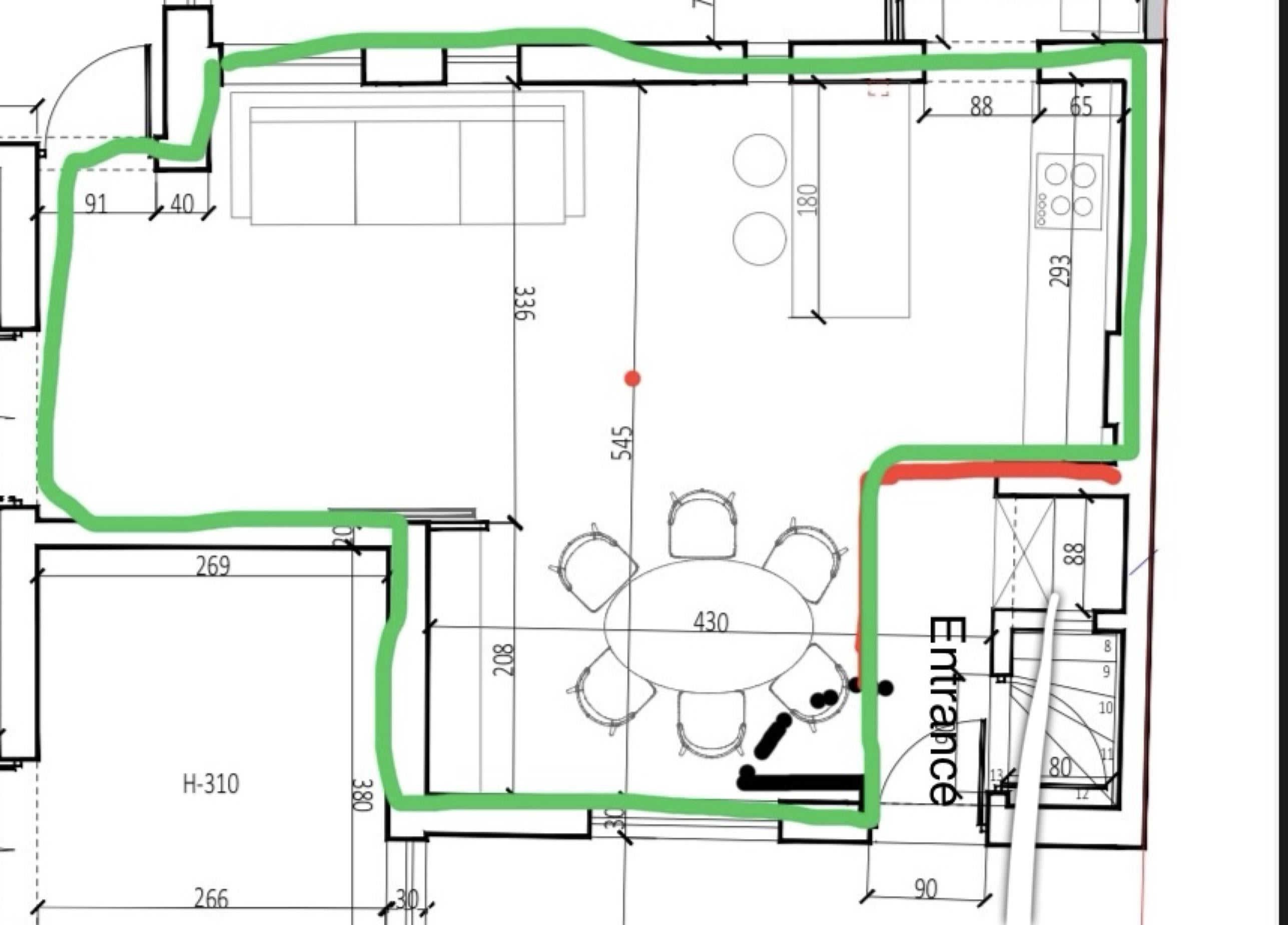こんにちは!!私はまだプロジェクト段階にある私の家のレイアウトの整理に取り組んでいます。計画の入り口近くの大きなダイニングテーブルを無視してください。実際には、そこに小さなものを置きます。赤い線には、メインの入り口をマークする壁があり、そこには小さなコートラックと靴のキャビネットが欲しいです。
