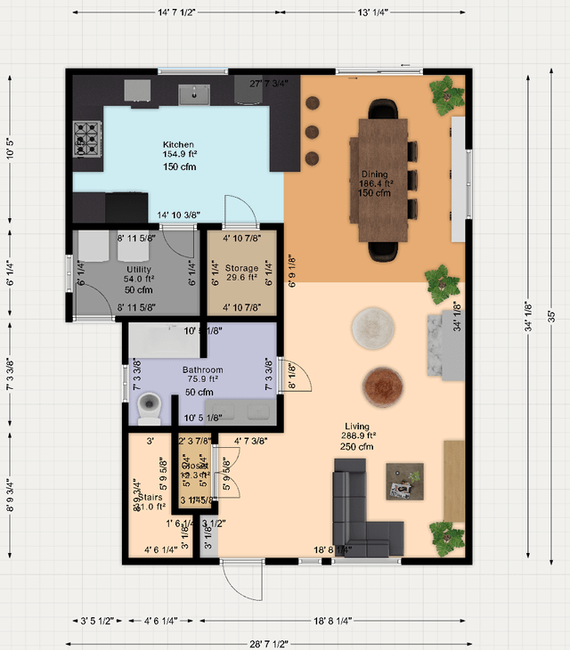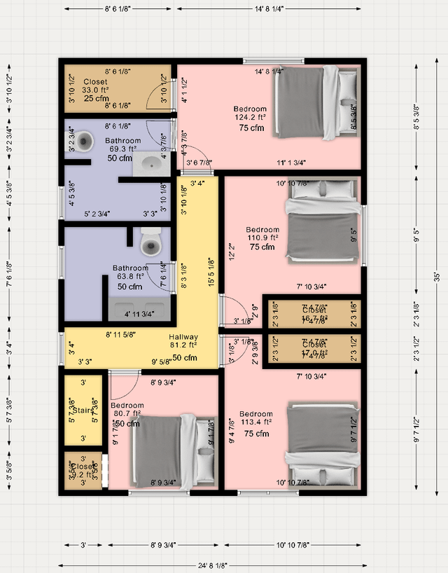 - 寝室には125平方フィート(クローゼットを含む)は大丈夫ですか?または、ベッドルームを4つではなく3つのベッドルームに下げて、ゲストベッドルームを削除するだけです。