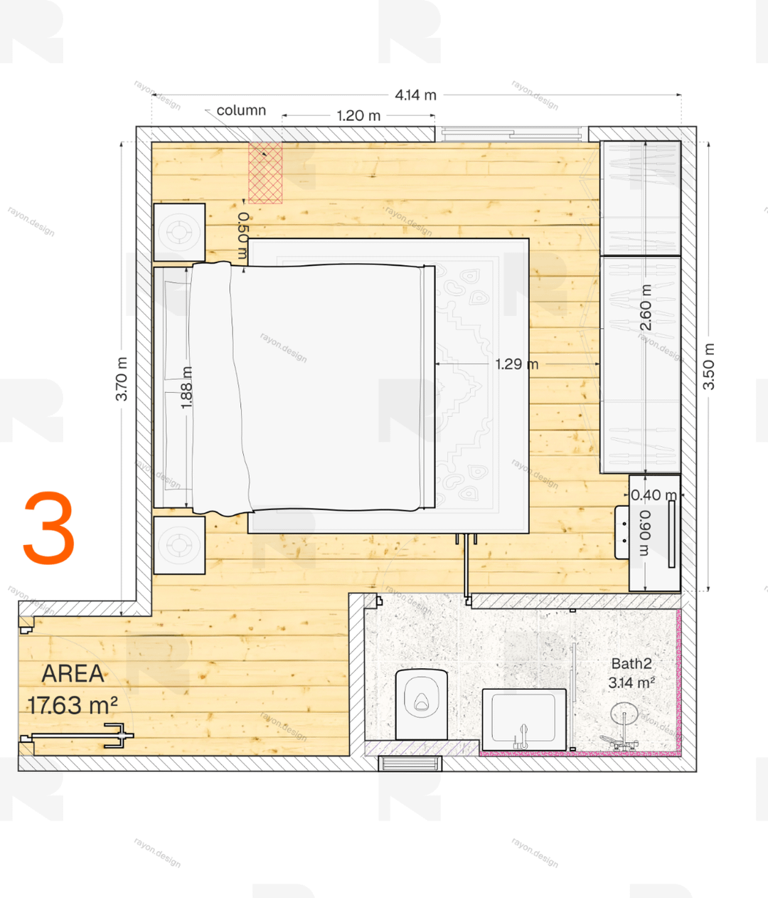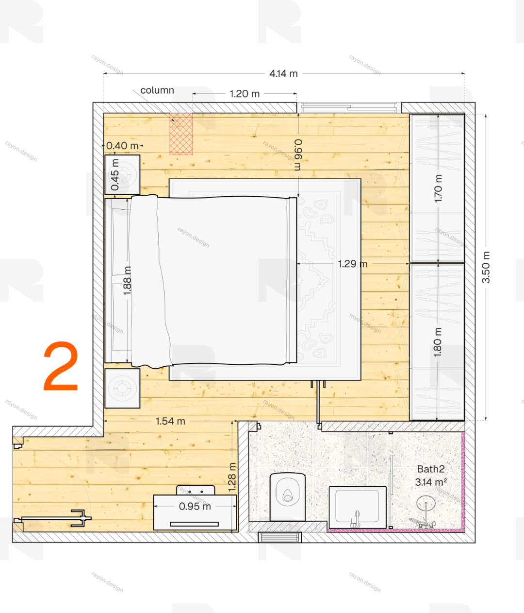 マスターベッドルームの最良のアレンジメントを見つけようとしています。壁の幅のワードローブとスタンドアロンのドレッシング/バニティデスク(1または2*)または、組み込み/接続されたデスク(3)を備えた小さなワードローブ(3)の間で、どちらを提案しますか? (他の提案は大歓迎です) *1と2の違いは、反対側の壁の机の配置です。
