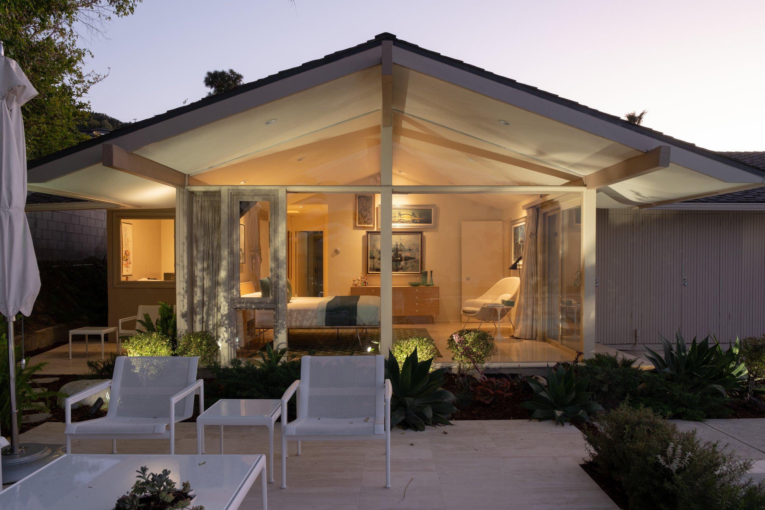 1959年に建築家のウォレス・ベントンとドナルド・ジーン・パークが設計した中世の近代的な家である盆地邸の寝室の屋外景色、カリフォルニア州サンフェルナンドバレー、 [2500×1667]