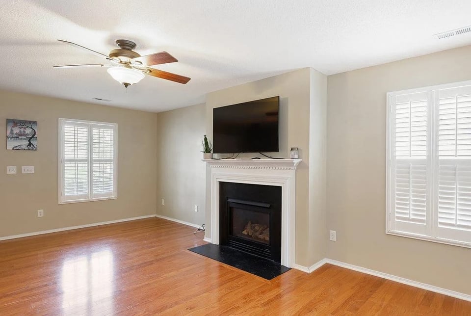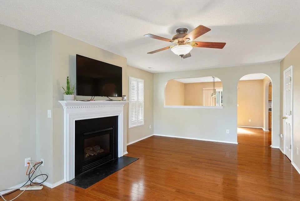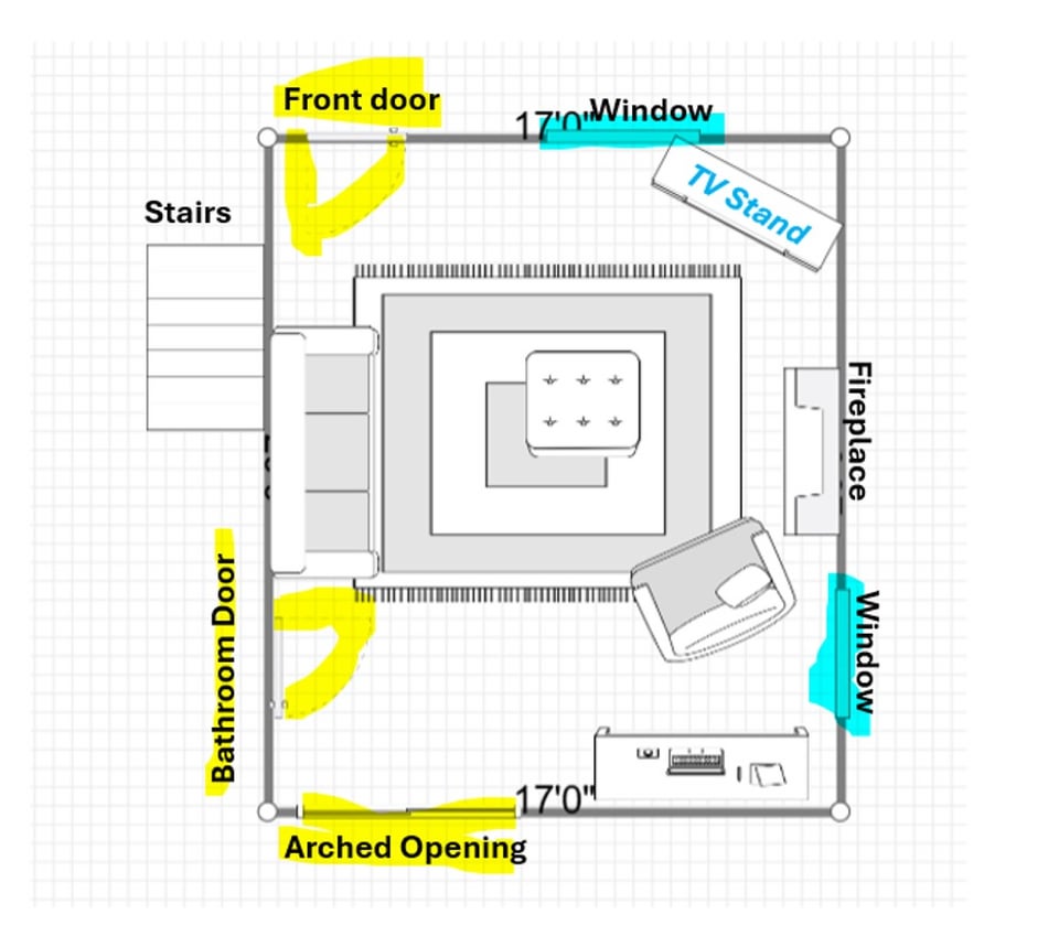 リビングルームを整理するための助けを探しています。リビングルーム、複数のドア、窓を通り抜けるため、このスペースは非常に扱いにくいです。アーチ型の開口部はダイニングルーム、そしてキッチンにつながっています。部屋の中で動かせない唯一のものは机です。私のSOはこの場所が気に入っているので、自宅で仕事をしているときに裏庭の庭を見ることができます。