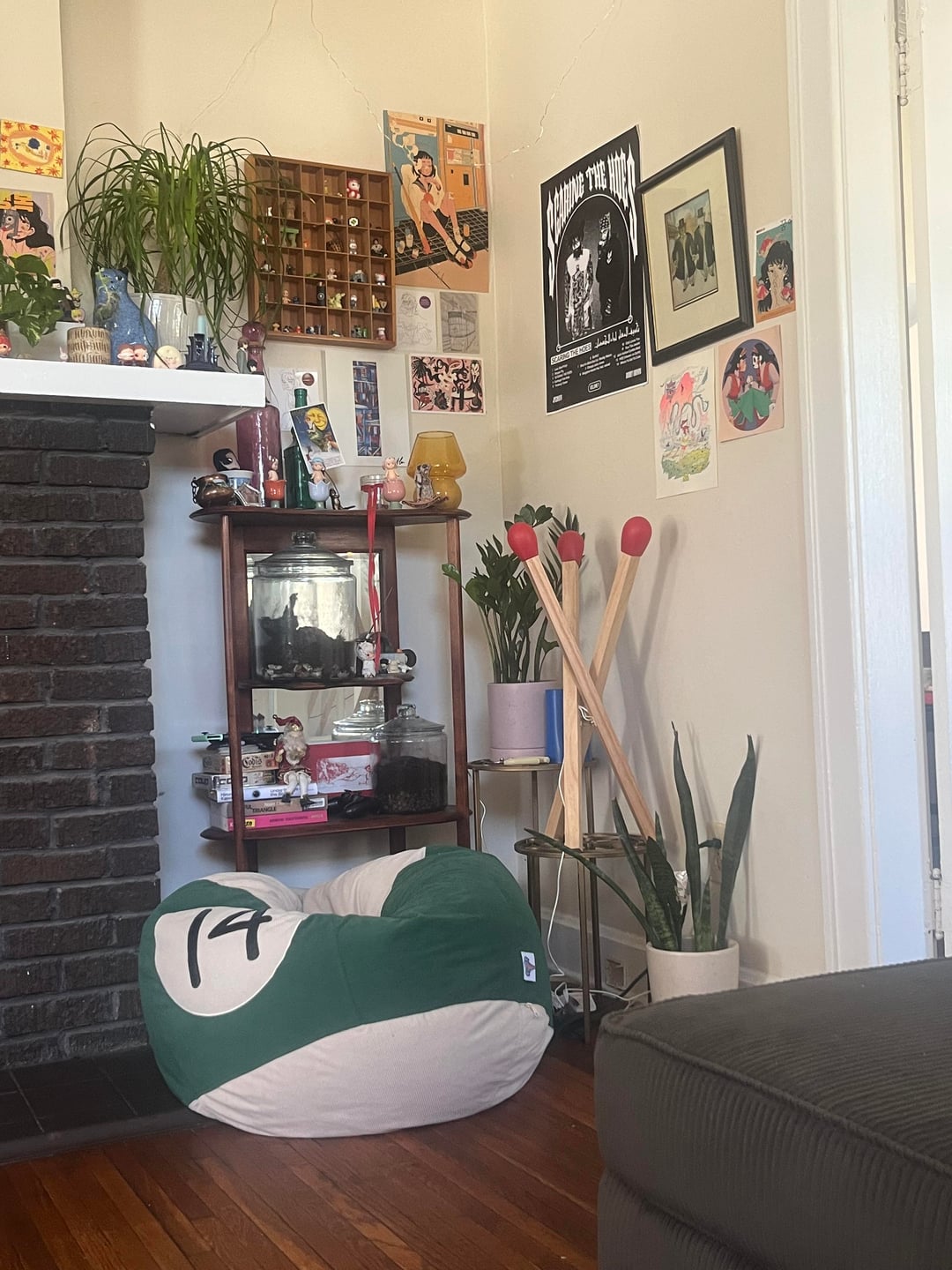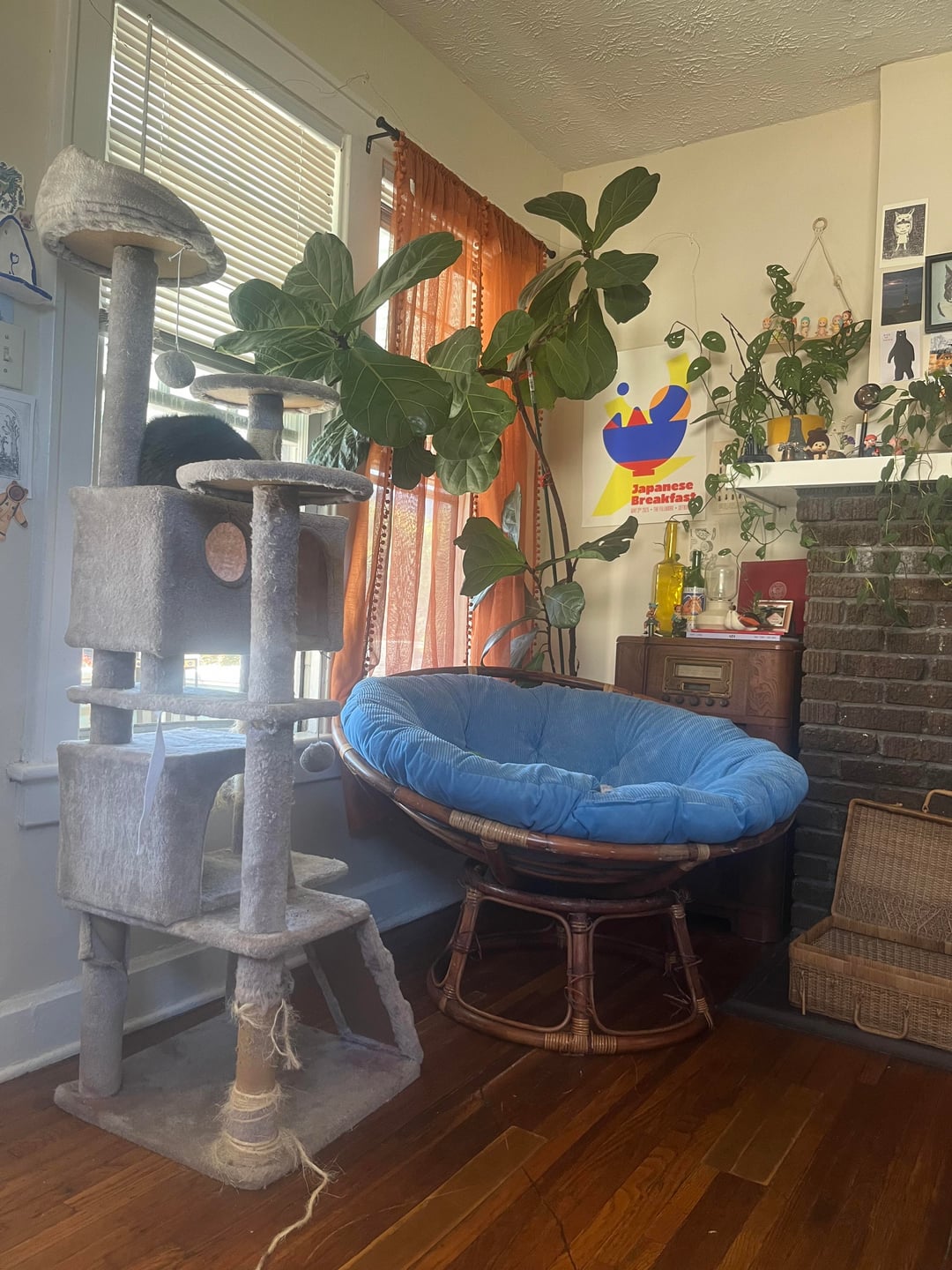 スタンドの位置は?最初に考えたのは真下だったのですが、青い椅子のあるコーナー(左 – 超混雑しているので手直しが必要ですが、猫たちはここのキャットツリーも気に入っています)やビーンバッグのあるコーナー(右 – これも少し忙しい(笑))に少し再構成することもできます。