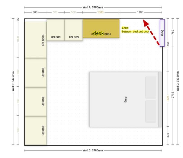 寝室のレイアウトを見直しているので、アドバイスをいただければと思います。扉は内開きなので、隣の壁に沿って机を置くと42cmくらいしかありません。") 完全に開いたドアの端と机の角の間。