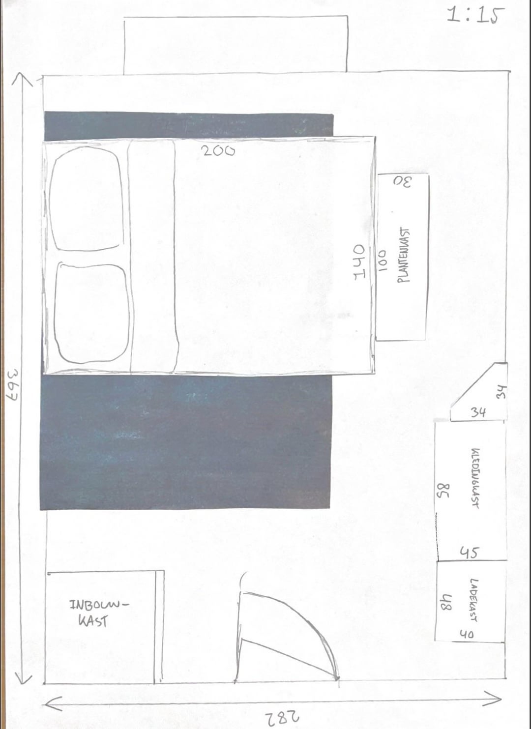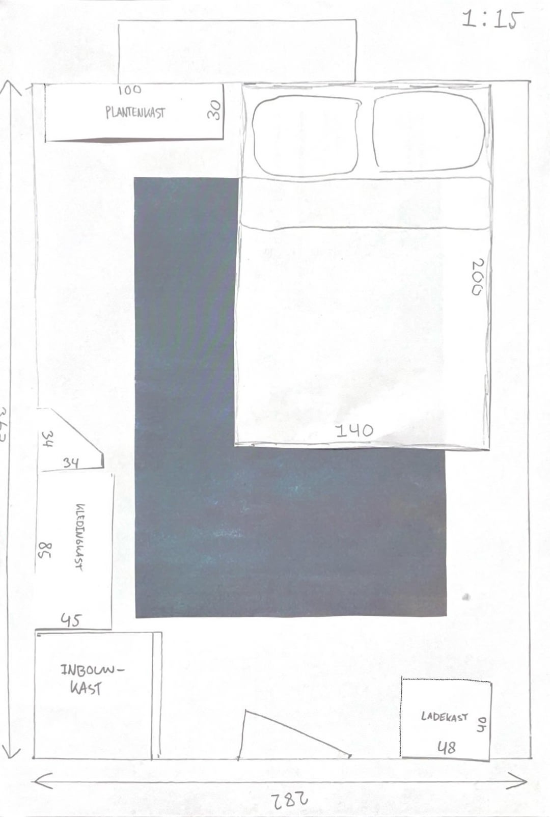 いくつかの翻訳: Kledingkast = ドレッサー (比較的背が高いですが、まだ見渡すことができます) Plantenkast = 植物の棚 (基本的には単なる細いテーブル) Ladekast = 引き出し (ドレッサーと同じ高さ) Inbouwkast = 内蔵クローゼット 三角形は、単なる小さな低いテーブルです。上部の余分なスペースは私の窓辺です。