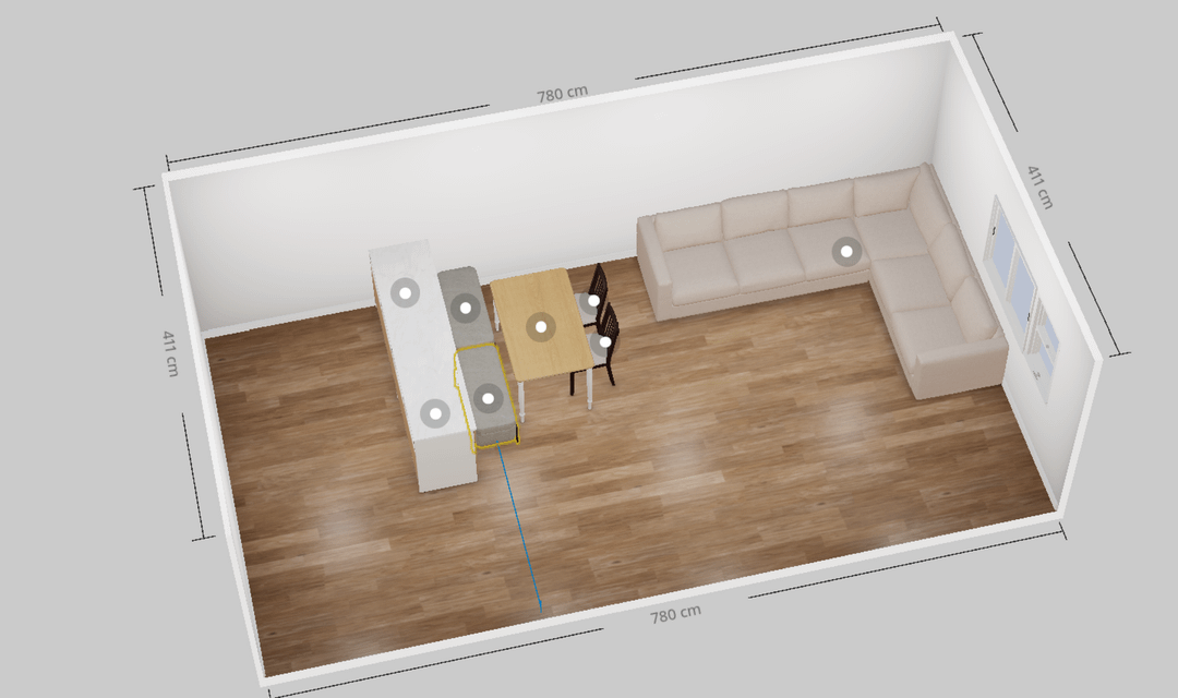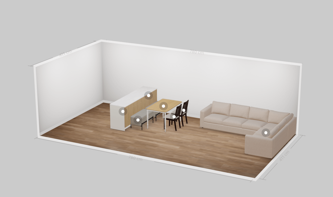 現在のデザインが出来上がりました IKEA Planner でのオリエンテーション目的のみ、それで、 実際の家具は見た目が異なります — このレイアウトは主に、比率と間隔の感覚を把握することを目的としています。