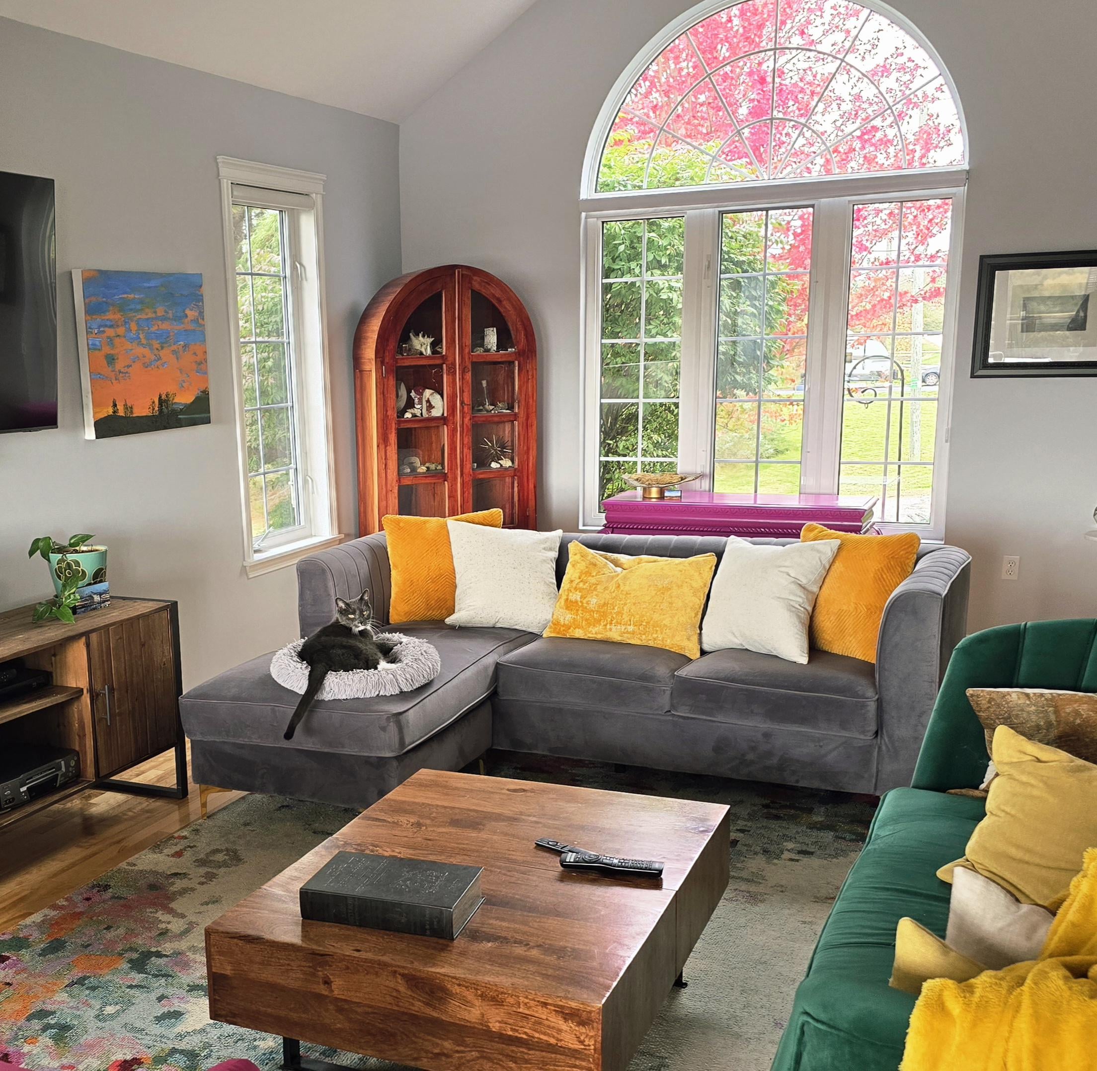 紅葉が美しいカエデの景色を望むリビングルーム。