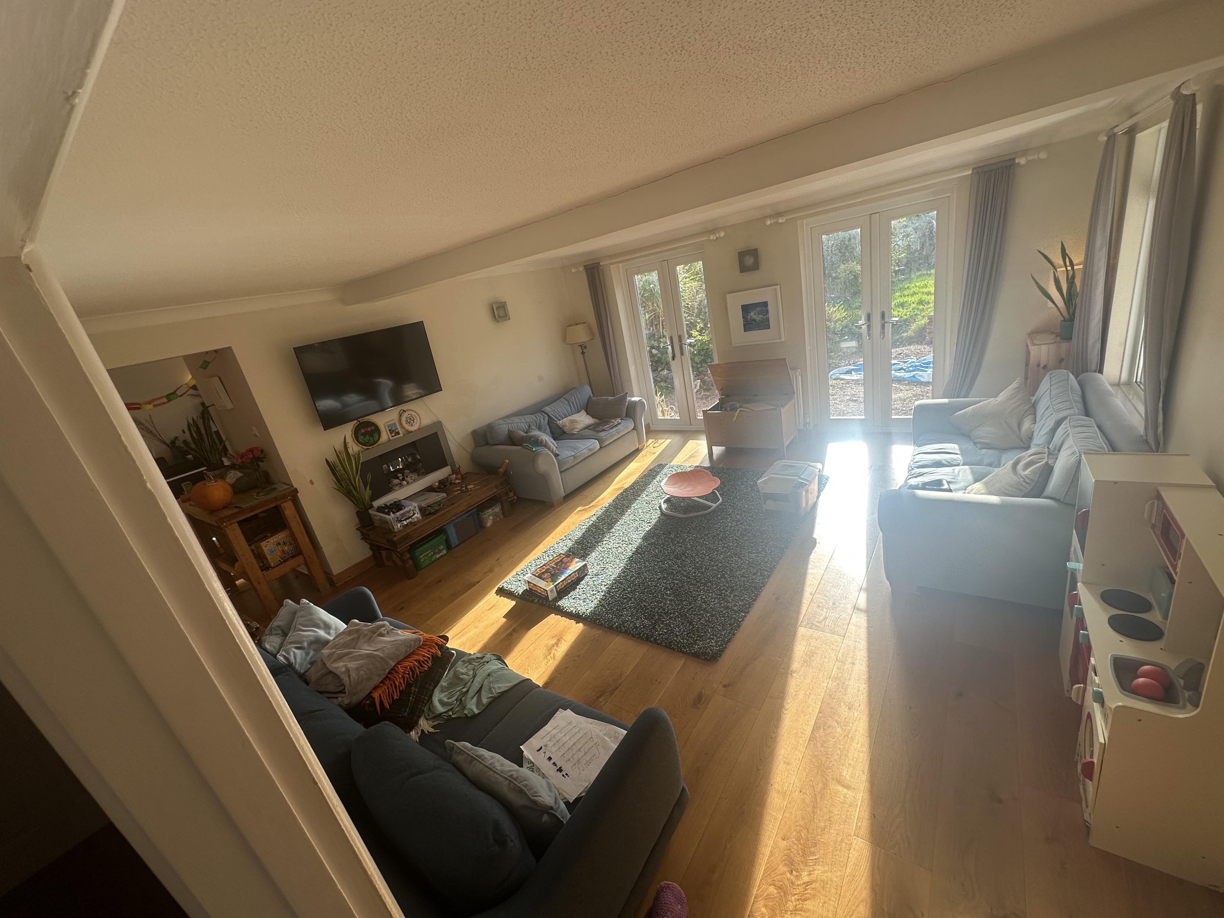 そして、キッチン/ダイニングは左側にあり、この写真で私が立っている場所からこの頻繁に使用される歩道を離れます。その結果、左側の壁 (写真では見えない壁) はテレビ/ユニットを置くのに適した場所ではなく、壁に向かってあるソファを移動する場合は、通路を離れるために最大 2 メートル移動する必要があります。 (アイデアとしては気に入っていますが、まだ完全には実現できていません)