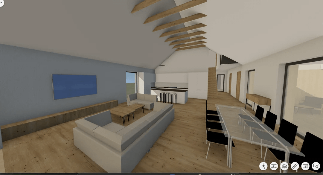 手短にお話します。私は現在、天井が高く、オープンプランのキッチン/リビングルームのある家を設計しています。キッチンのデザインに最適なアプローチ方法についてアドバイスが必要です (詳細ではなく一般的に)。計画図と Bimx の視覚化を添付します (空間の全体像を示すためだけに)。