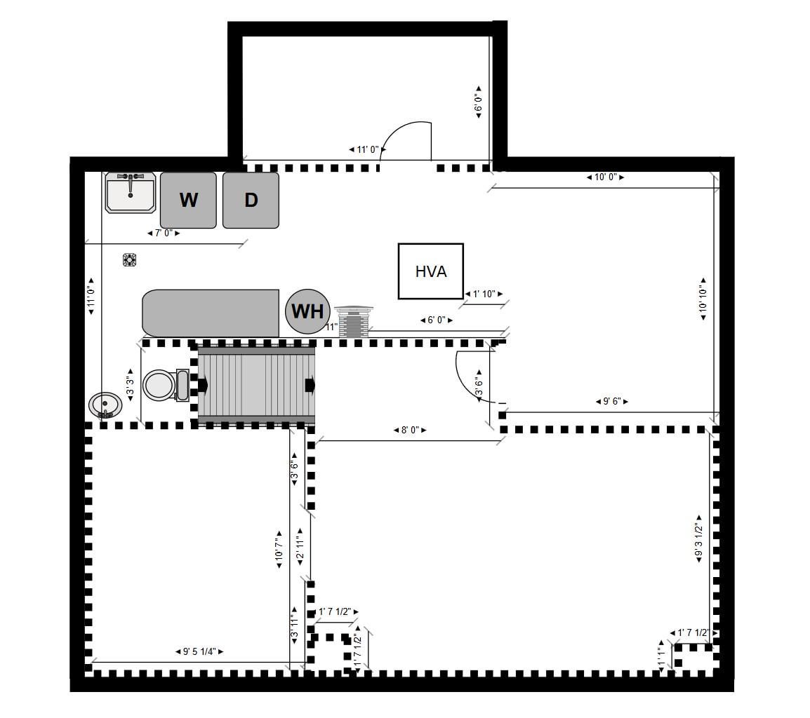 未完成の地下室の全面改修を計画しています。平面図上の太い黒い線はコンクリートブロック基礎壁を表し、破線は前の所有者によって設置された古い、コードのない内壁を示しています。それらを削除して新しく始めます。