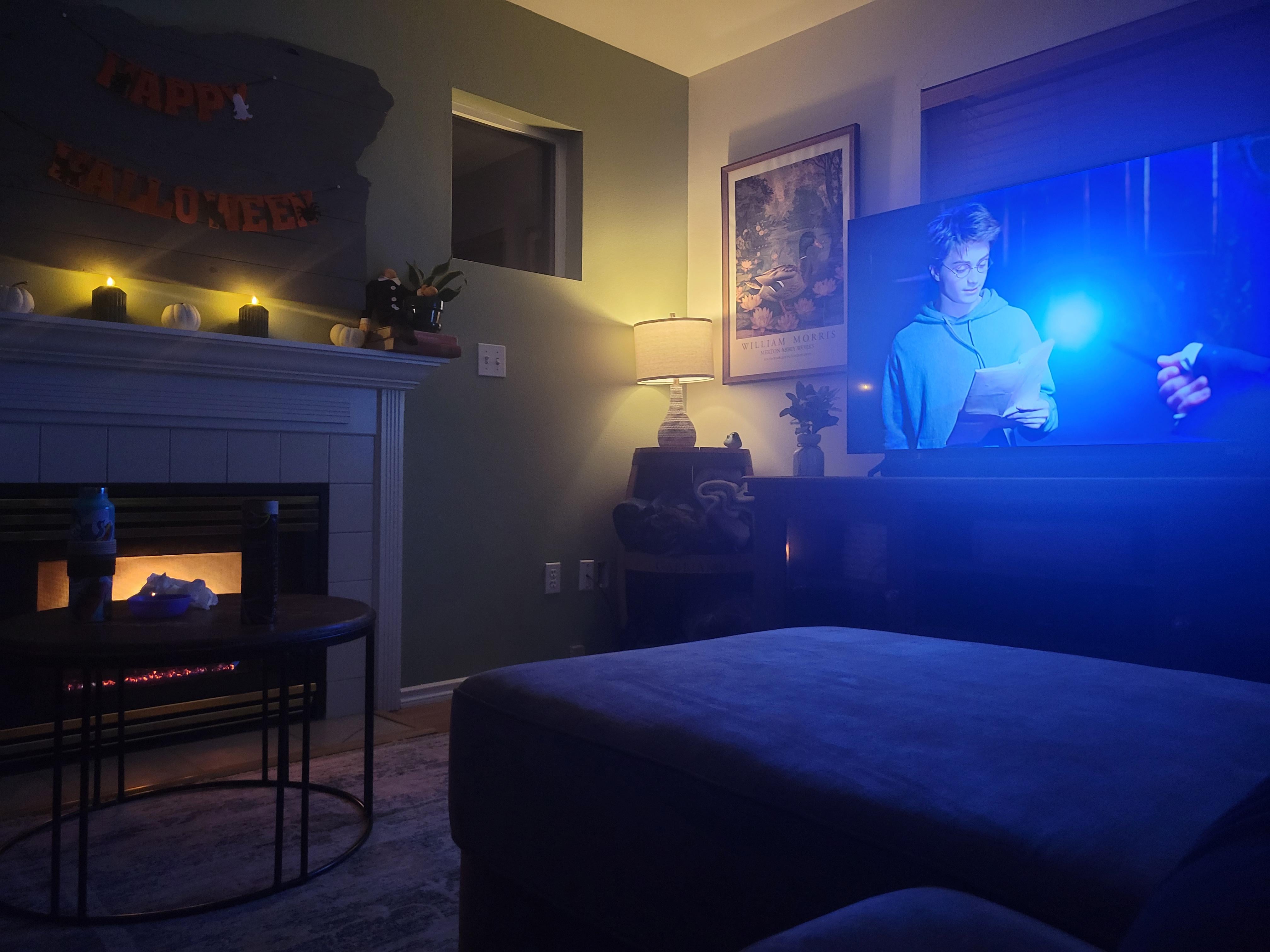 暖炉のある居心地の良い秋の夜、ハリー・ポッターを見に行く