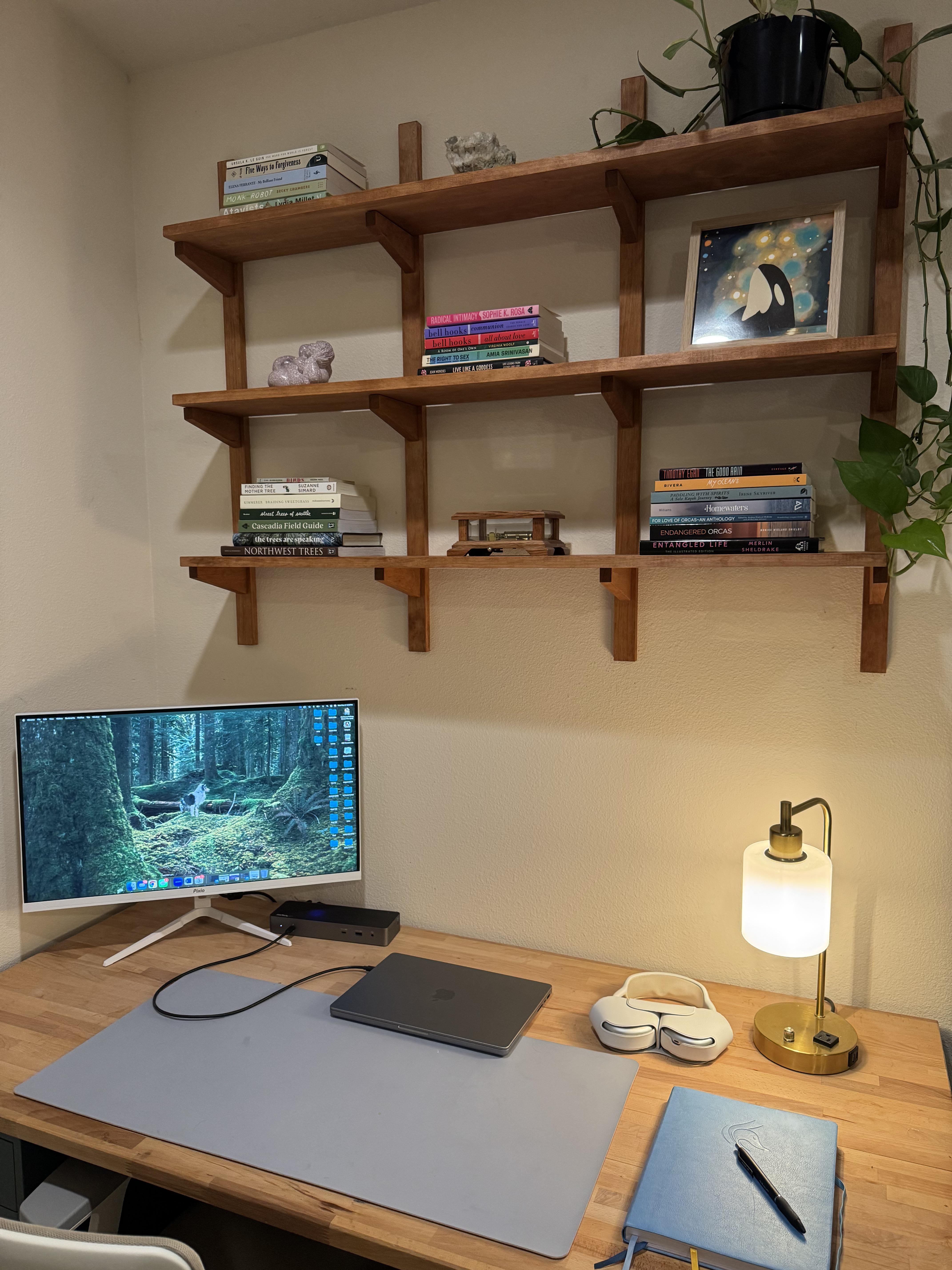 パートナーが居心地の良いデスクのセットアップ用の棚をデザインして作ってくれました