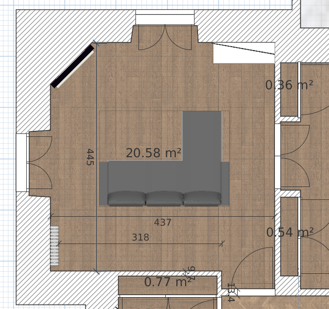 写真では、左上近くの黒い長方形は機能的な暖炉です。右上は 2 ドアの BESTA テレビベンチで、その上に 55 インチのテレビが置かれています。すでにソファ(254x166cm)を所有しているので、それを中心に部屋をアレンジしようとしています。これが私たちの現在の試みですが、満足のいくものではありません。ソファを壁に寄せて置くのは遠すぎるかもしれませんが、現在のアプローチでは、テレビがちょうどソファの正面にあるわけでもありません。
